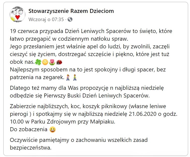 Wczorajszy dzień na fb zakończyła wpisem: – Razem z Stowarzyszenie Razem Dzieciom serdecznie zapraszam i polecam World Sauntering Day – czyli Światowy Dzień Leniwych Spacerów w Busku Zdroju ???? #buskozdroj #tlen #spacer