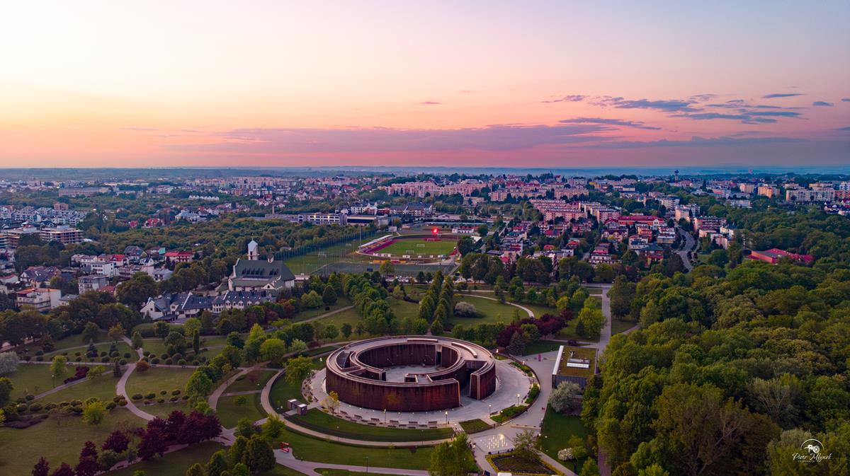 Ale dziś zabieramy Was wyżej. Z wysokości, z której widać więcej – i czuje się głębiej. Oto Busko z lotu ptaka. W obiektywie udało się uchwycić dwa symbole duchowej tożsamości miasta – Kościół Niepokalanego Poczęcia NMP’ w samym sercu Buska oraz nowoczesne, zachwycające formą Sanktuarium św. Brata Alberta. Dwa miejsca – jedno zakorzenione w historii, drugie odważnie patrzące w przyszłość – a jednak w idealnej harmonii, splecione światłem i przestrzenią.
