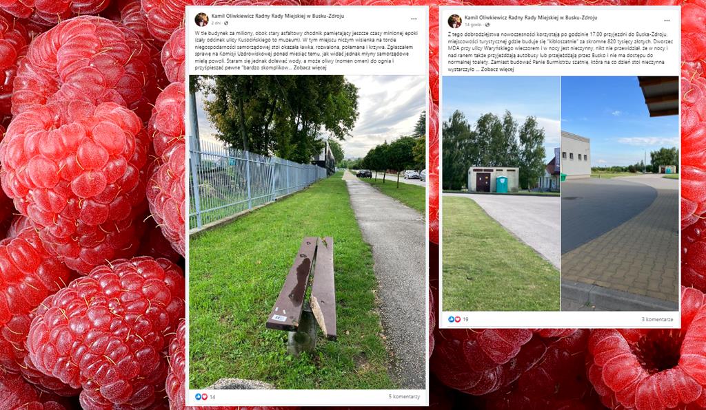 Stażem i peselem najmłodszy, aktywnością wybijający się, buski rajca, radny Kamil Oliwkiewicz, w ostatnich dniach na swoim facebookowym profilu przedstawił dwie kolejne „Buskie Maliny”: stan i wygląd ulicy Kusocińskiego (18.07.2023) oraz problem niedostępnych dla podróżnych wieczorem i nocą toalet na Miejskim Dworcu Autobusowym(20.07.20230)