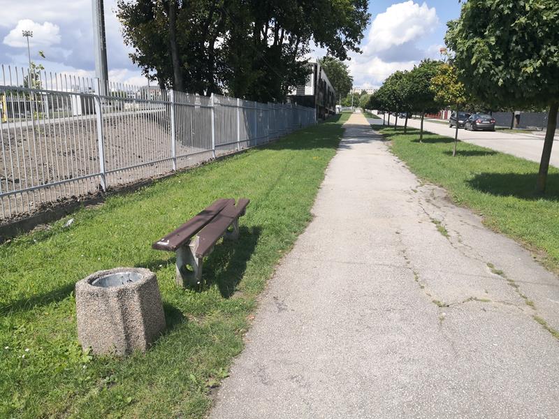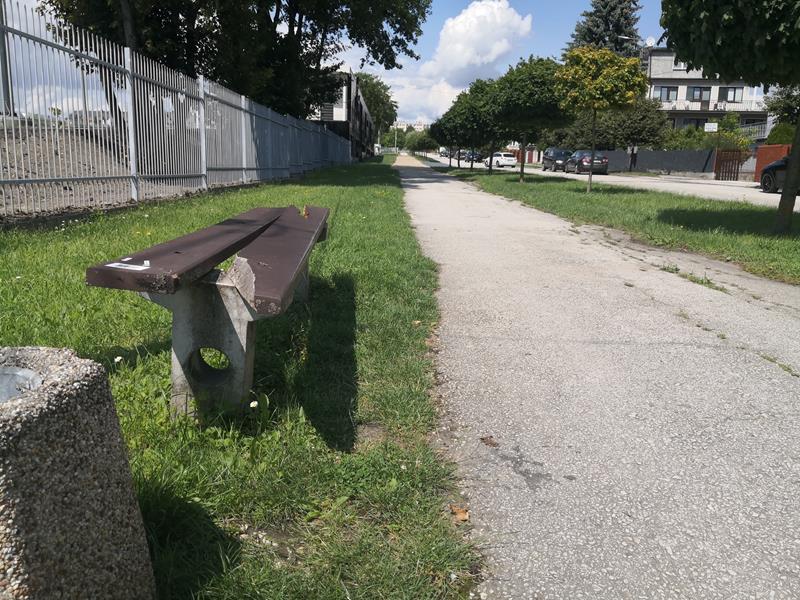 KO: W tle budynek za miliony’, obok stary asfaltowy chodnik pamiętający jeszcze czasy minionej epoki (cały odcinek ulicy Kusocińskiego to muzeum). W tym miejscu niczym wisienka na torcie niegospodarności samorządowej stoi okazała ławka, rozwalona, połamana i krzywa.