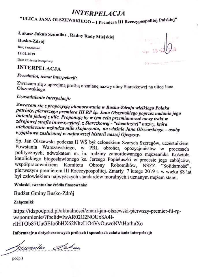Radny Łukasz Szumilas poinformował na swojej fb’stronie, iż złożył w biurze Rady Miejskiej interpelację w sprawie nadania jednej z ulic miasta słońca imienia zmarłego 7 lutego 2019 r. premiera Jana Olszewskiego