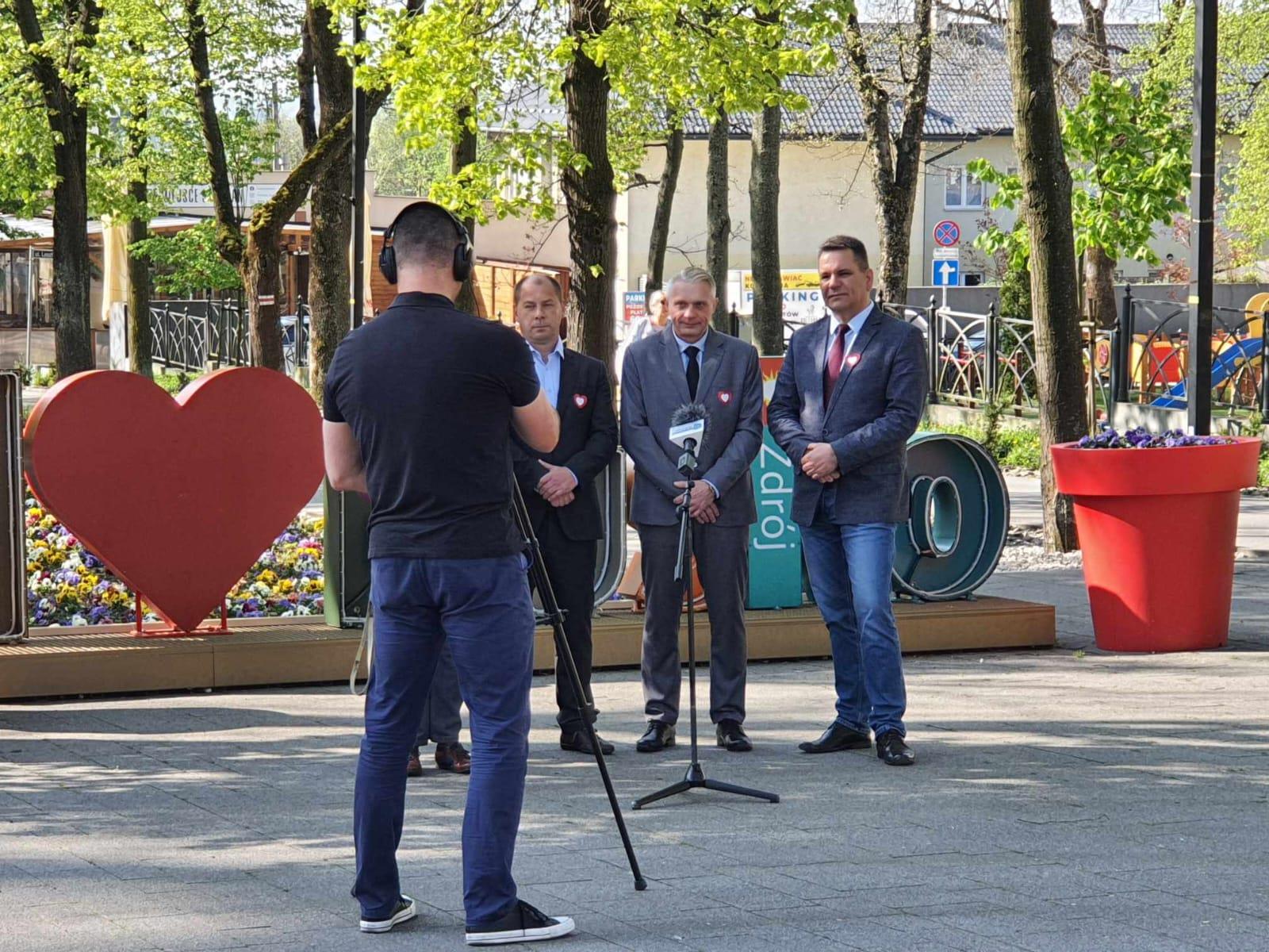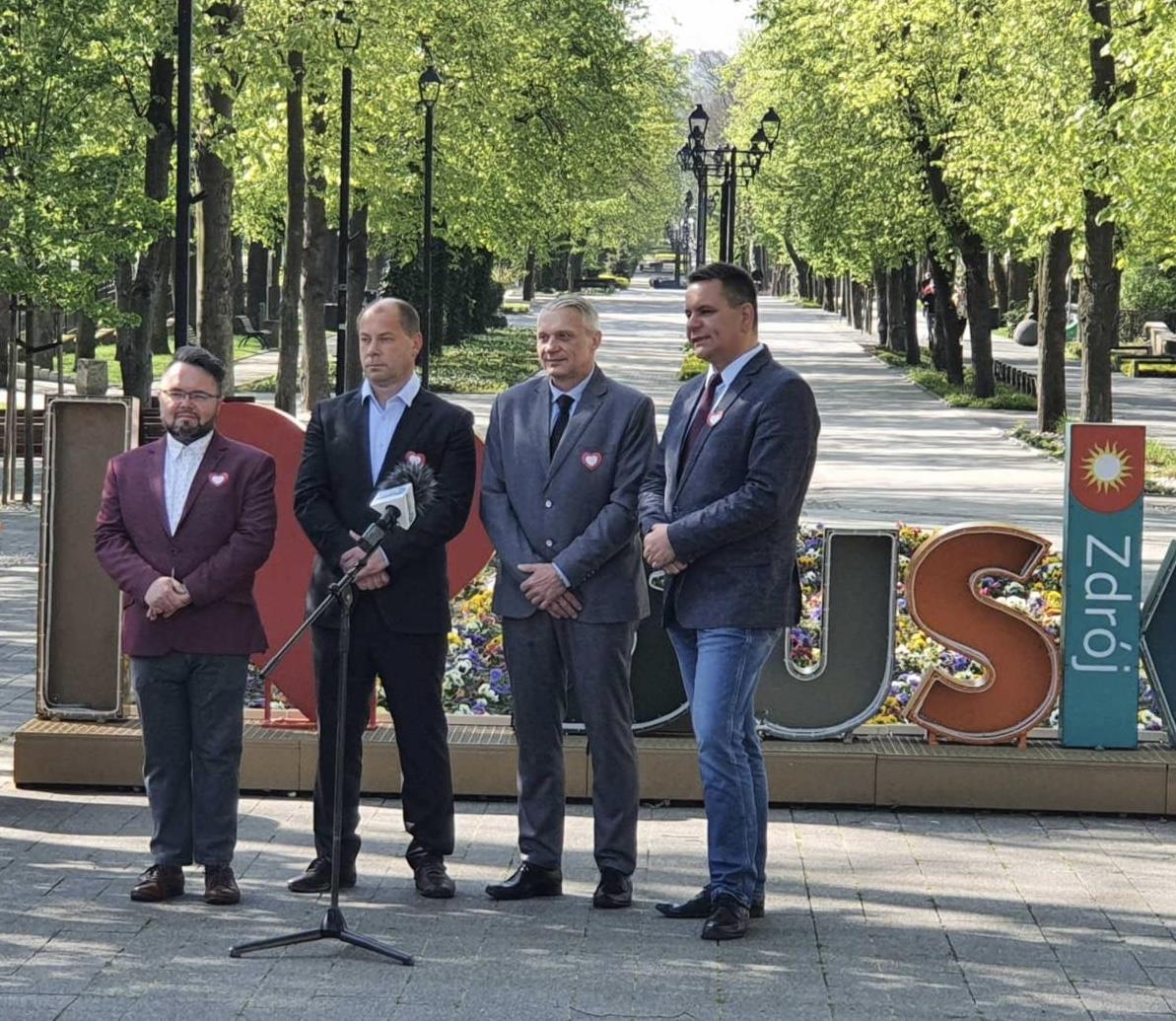 ○ 13.04.2024, Busko-Zdrój: Konferencja prasowa KKW Koalicja Obywatelska na Al. Mickiewicza, od lewej: Kamil Oliwkiewicz’, Paweł Ściubisz’, Paweł Solarski’, Andrzej Bydłosz’. / fot. KKW KO