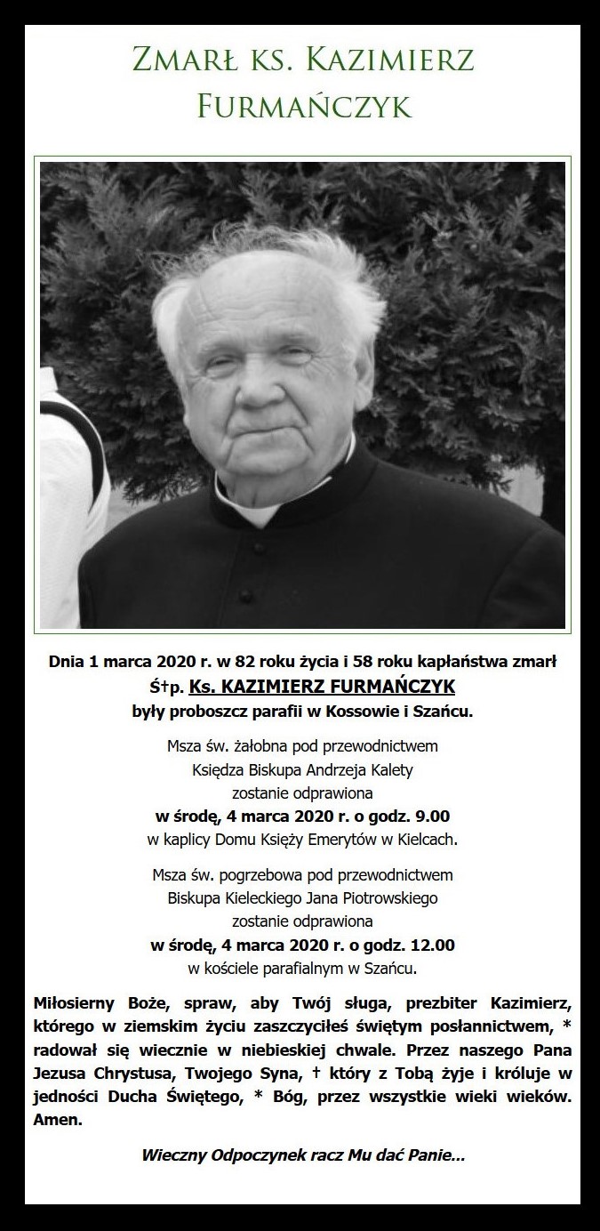 Dnia 1 marca 2020 r. w 82 roku życia i 58 roku kapłaństwa zmarł śp. ks. Kazimierz Furmańczyk, były proboszcz parafii w Kossowie i Szańcu. – informuje na swojej e-stronie Diecezja Kielecka