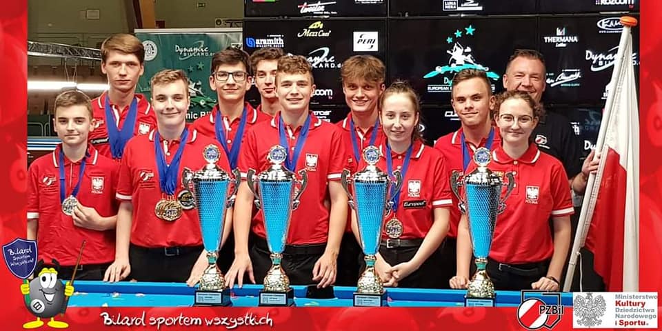 3. Austria 2 – 1 – 2 – 5Fantastycznie spisali się nasi juniorzy w zakończonych w Słowenii Mistrzostwach Europy Juniorów w Bilard. Nasi reprezentanci wywalczyli aż 1️⃣2️⃣ medali w tym 4️⃣ złote, 5️⃣ srebrnych i 3️⃣ brązowe. Polska wygrała klasyfikacje medalową Mistrzostw, a najlepszym zawodnikiem w grupie juniorów starszych został Szymon Kural !!!. Indywidualne tytuły mistrzów Europy powędrowały w grupie juniorów starszych w 8 bil do Szymon Kural( TCF Hub Kraków ), w grupie juniorów młodszych w 8 bil do Dominik Jastrząb ( UKS Fair Play Jaworzno ) oraz w grupie dziewcząt w odmianie 9 bil do Dominiki Pawełczyk ( UKS Miłek Wiślica ). Cała trójka wywalczyła również awans do finałów mistrzostw świata juniorów, które w październiku odbędą się w Austrii. To był jeden z najlepszych występów naszych reprezentantów w finałach mistrzostw Europy juniorów. Jak podkreślił trener kadry Bogusław Bereżny świetna praca w klubach prowadzona przez klubowych trenerów, przepracowany cały ubiegły rok pomimo pandemii na zgrupowaniach kadry narodowej oraz imprezach przyniósł fantastyczne wyniki. Oczywiście największe gratulacje należą się młodym zawodniczkom i zawodnikom, ale duże podziękowania kierujemy na ręce trenerów, opiekunów, rodziców, szefów klubów sponsorów bo bez ich pomocy nie mielibyśmy tak ogromnych powodów do radości. Dziękujemy również za wsparcie naszych działań i dofinansowywanie startów i zgrupowań przez Ministerstwo Kultury I Dziedzictwa Narodowego oraz Partnerów Polski Związek Bilardowy