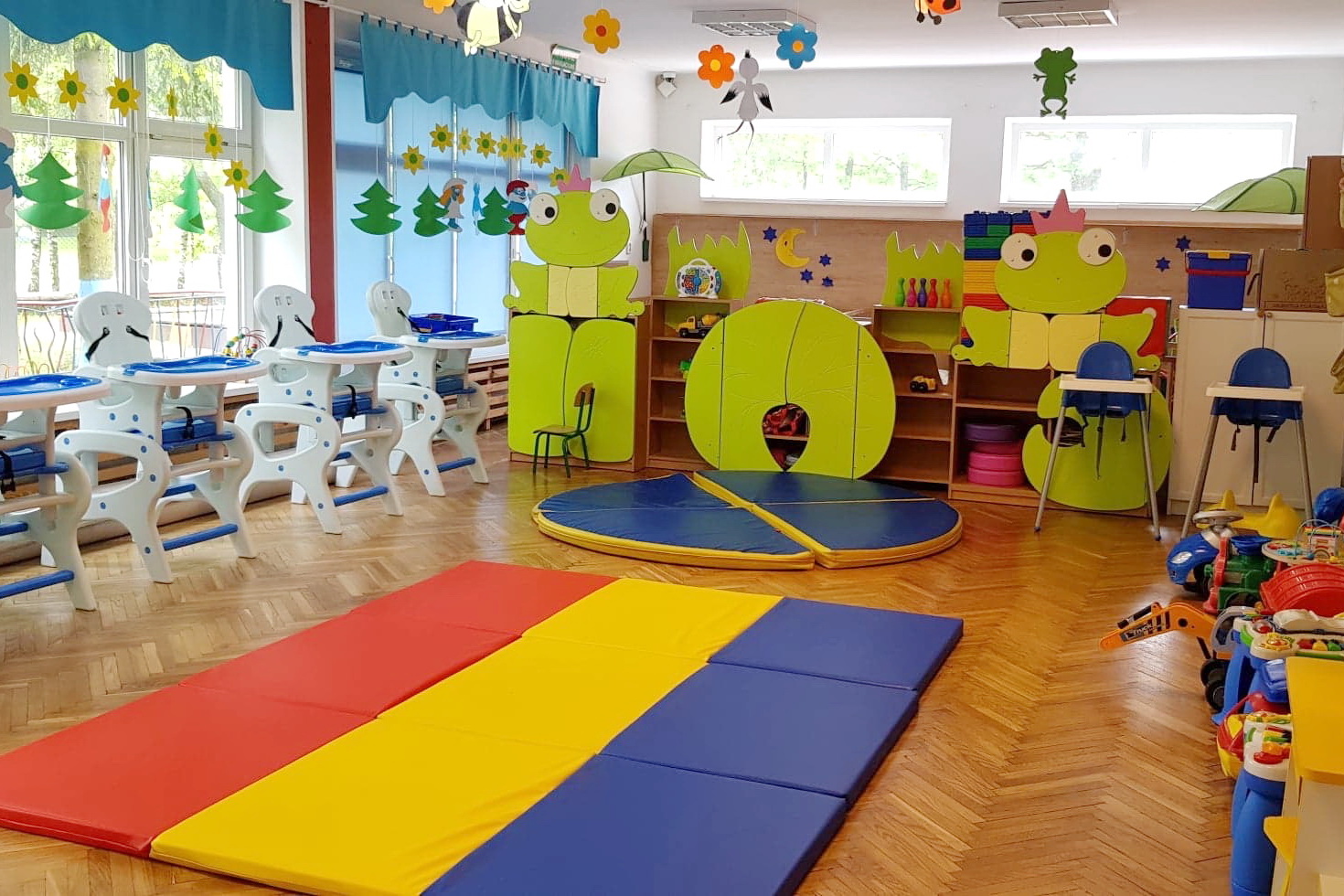 Dzieci przebywają w dużych, przestronnych, dobrze naświetlonych salach. Przedszkole dysponuje własna salą gimnastyczną, wyposażoną w nowoczesny sprzęt i przyrządy do ćwiczeń, gimnastyki, treningów oraz zajęć rehabilitacyjnych i fizjoterapeutycznych. Dzieci mają do dyspozycji duży, w pełni urządzony ogrodzony plac zabaw z miejscem przeznaczonym na jazdę konną.
