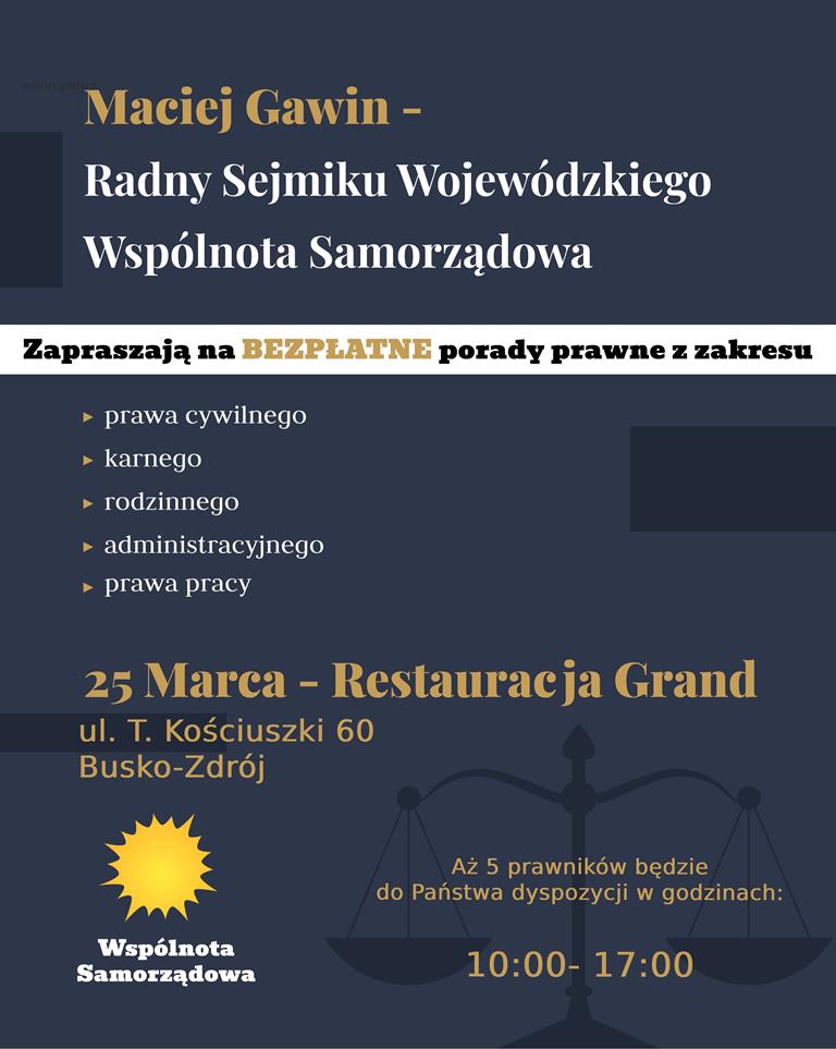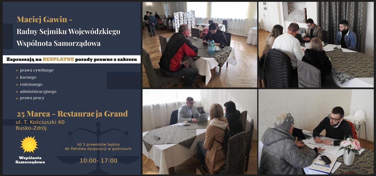 W sobotę, 25 marca 2023 r., w restauracji Grand w Busku-Zdroju radny sejmiku województwa Maciej Gawin wraz ze Wspólnotą Samorządową Busko-Zdrój zorganizował sesję bezpłatnych porad prawnych dla wszystkich zainteresowanych osób z powiatu buskiego i okolic. – informuje25 marca 2023 r. portal Echo Dnia