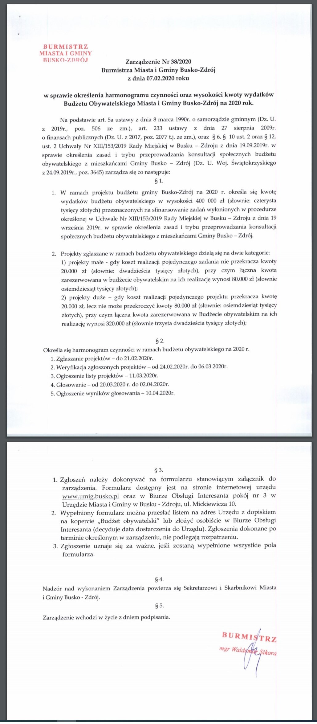 Urząd Miasta i Gminy Busko-Zdrój opublikował zarządzenie w sprawie określenia harmonogramu czynności oraz wysokości kwot wydatków Budżetu Obywatelskiego Miasta i Gminy Busko-Zdrój na 2020 rok. Łączna kwota jaką władze oddają tym razem do dyspozycji mieszkańców na inicjatywy obywatelskie to 400.000 zł. Przy łącznej kwocie planowanych wydatków budżetu Gminy na 2020 rok w wysokości 193.644.681 zł stanowi to jedynie 0,21%