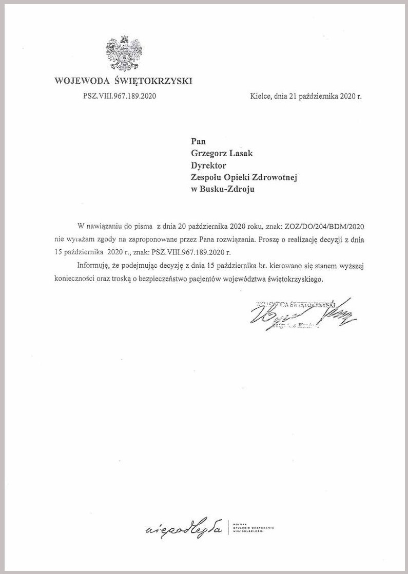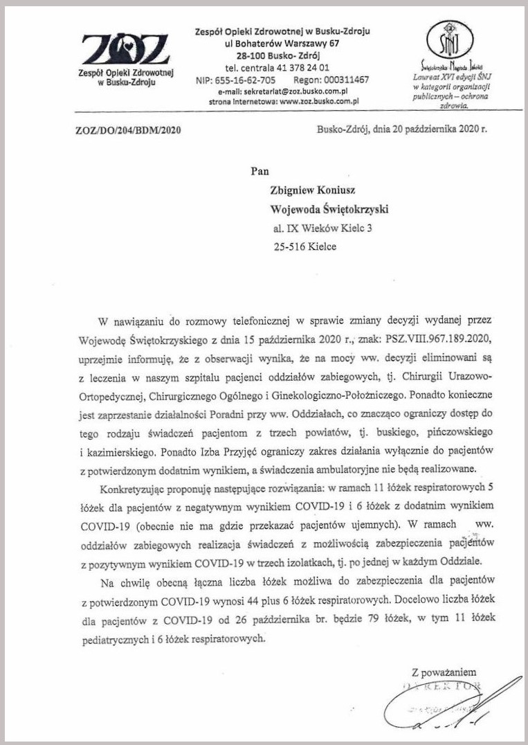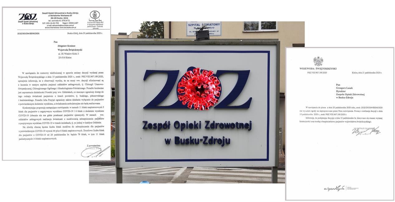 Trudna sytuacja zapanowała w buskim szpitalu powiatowym, który na polecenie wojewody świętokrzyskiego Zbigniewa Koniusza ma zostać przekształcona w lecznicę jednoimienną i do końca października ma zapewnić ponad 200 łóżek wyłącznie dla osób zakażonych koronawirusem, w tym 11 respiratorowych. Dyrektor lecznicy Grzegorz Lasak zawnioskował o zmianę decyzji, ale od wojewody otrzymał odmowę. informuje strona ZOZ Busko-Zdrój