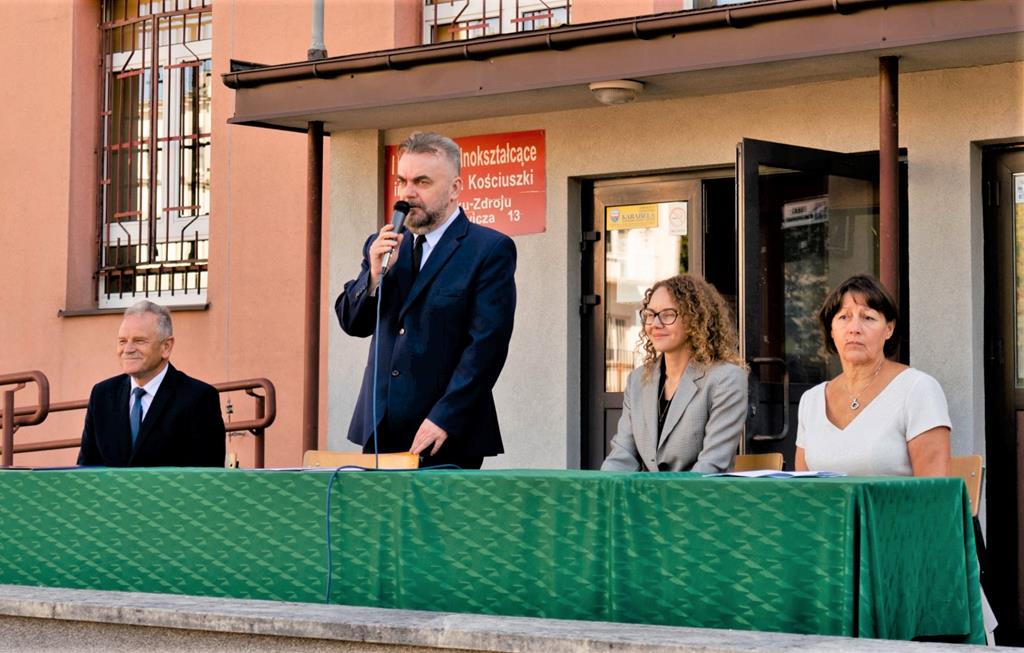 ○ 1 września 2022, Busko-Zdrój: Uroczysta inauguracja nowego roku szkolnego 2022/2023 w I Liceum Ogólnokształcącym im. Tadeusza Kościuszki♂. Na zdjęciu od lewej: starosta buski Jerzy Kolarz, dyrektor Tomasz Galant, wicedyrektor Ewelina Szymczyk-Krzemińska’, wicedyrektor Anna Kolarz’. / źródło: lo1busko.edupage.org♂