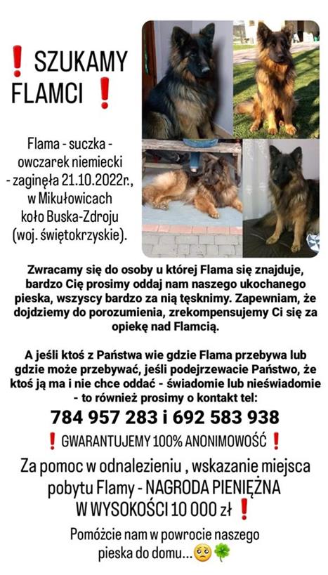 Flama, owczarek niemiecki, zaginął 21 października 2022 r., w Mikułowicach’ w gminie Busko-Zdrój. Właściciele psa nie ustają w poszukiwaniach, mimo, że od zdarzenia minęło już siedem miesięcy. Wyznaczyli wysoką nagrodę – 10.000 złotych, zaangażowali znanego jasnowidza. Wszystko na ten czas na próżno. Jeszcze raz zwracają się więc o pomoc.- informuje 25.05.2023 portal Echo Dnia