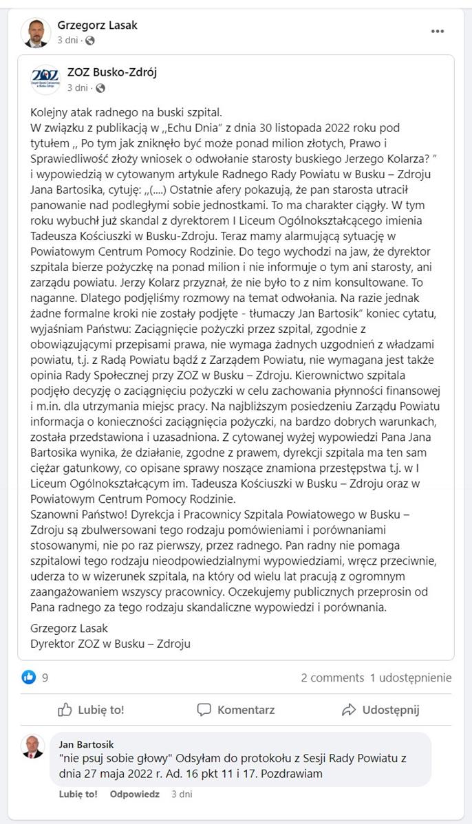 W środę, 30 listopada pojawiły się doniesienia o tym, że klub radnych Prawa i Sprawiedliwości w Radzie Powiatu Buskiego zastanawia się nad złożeniem wniosku o odwołanie starosty buskiego Jerzego Kolarza. Przyczyną jest to, że, jak mówi radny PiS Jan Bartosik, „starosta utracił panowanie nad podległymi sobie jednostkami”. Na te słowa ostro zareagował Grzegorz Lasak, dyrektor buskiego szpitala.– informuje 1 grudnia 2022 portal Echo Dnia