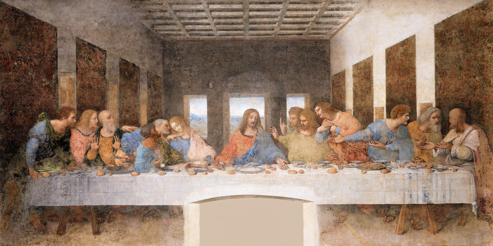 ○ Leonardo da Vinci (1452-1519): „Ostatnia Wieczerza” ♂/ mural malowany temperą od 1495 do 1498, wymiary: 880 cm x 460 cm. Przedstawione osoby: Jezus , Bartłomiej Apostoł, Jakub, syn Alfeusza, Andrzej Apostoł, Judasz Iskariota, Piotr, Jan Apostoł, Tomasz Apostoł, Jakub Starszy, Filip Apostoł, Mateusz Apostoł, Juda Apostoł, Szymon Zelota