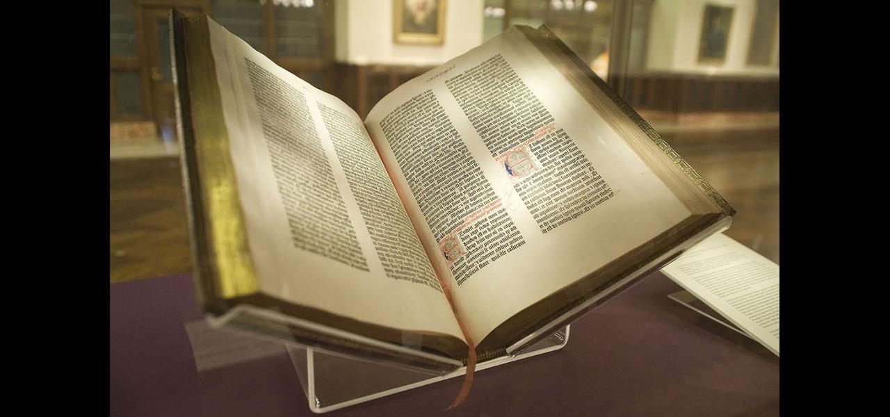 ○ Biblia Gutenberga♂ – pierwsze wydawnictwo dziełowe w Europie wykonane za pomocą druku, przy użyciu czcionki ruchomej. Jest kompletnym wydaniem Pisma Świętego. Księga została przygotowana do druku i wydrukowana w latach 1452–1455 w Moguncji przez Johannesa Gutenberga . Na zdjęciu: egzemplarz z Nowego Jorku/ źródło: Wikipedia♂