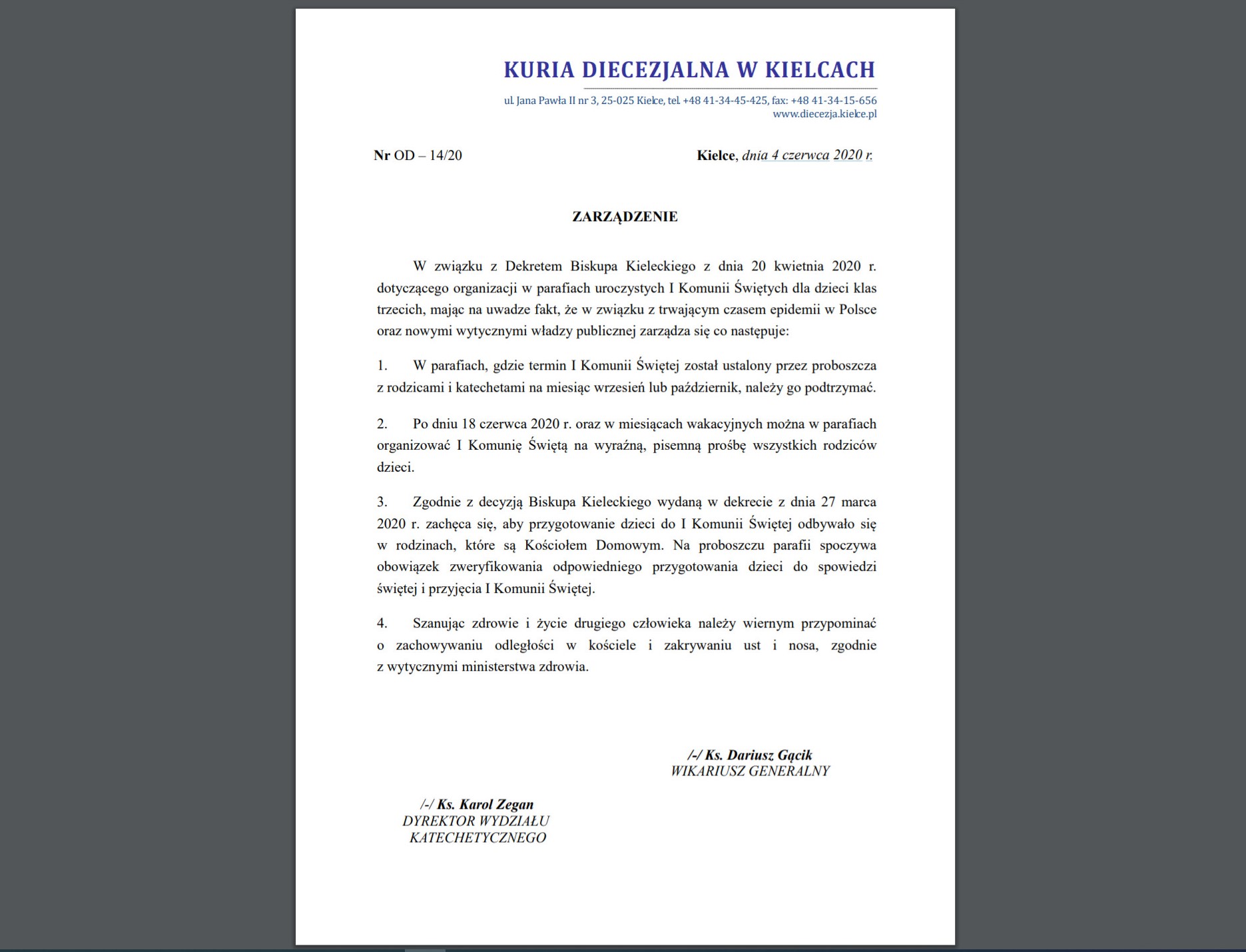 Zarządzenie Kurii Diecezjalnej w Kielcach z dnia 4 czerwca 2020 r. / źródło: diecezja.kielce.pl