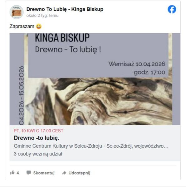 Jedna odpowiedź do “Gminne Centrum Kultury w Solcu-Zdroju: „Drewno – to lubię” – wernisaż pierwszej autorskiej wystawy prac Kingi Biskup – 10.04.2026 godz.17:00”