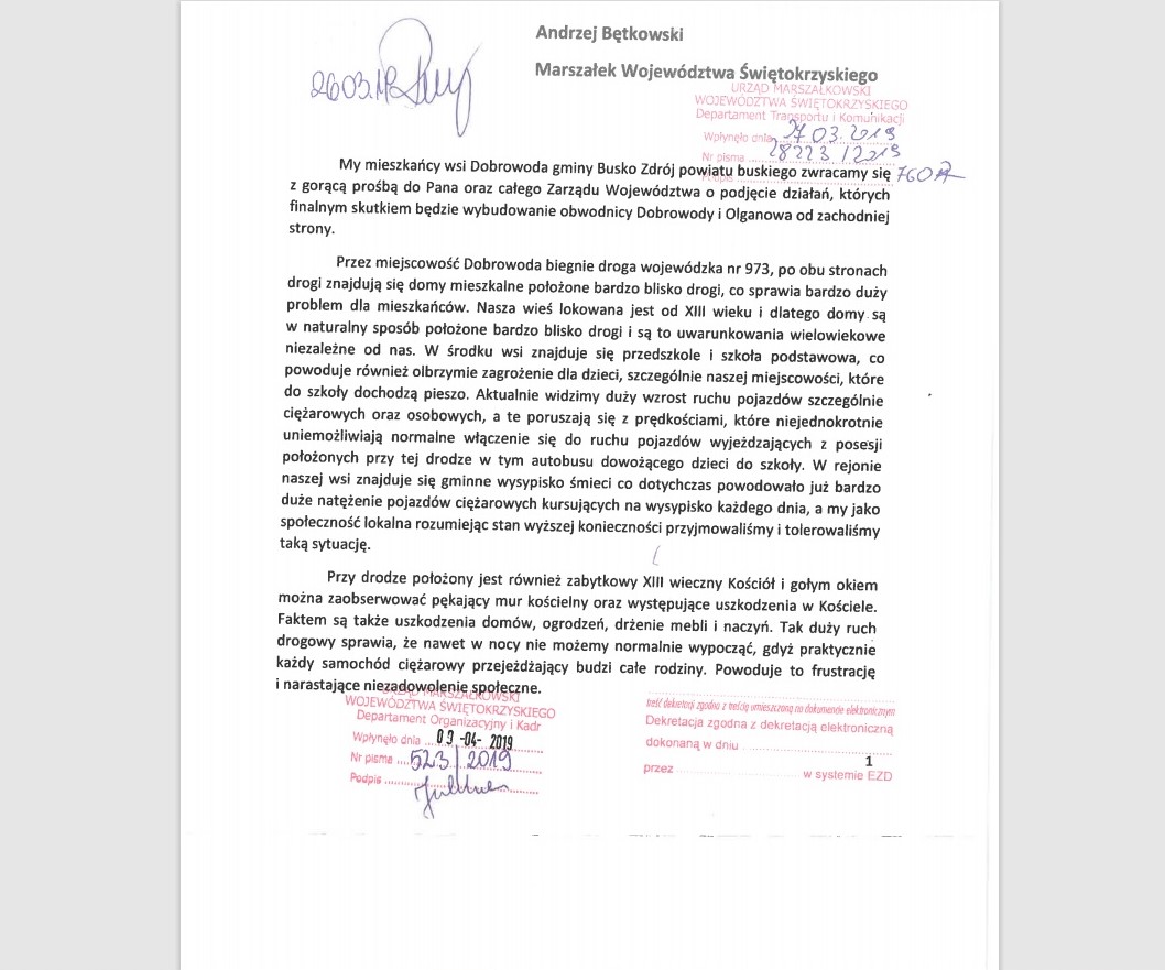 Myślę, że możnaby poprowadzić obwodnicę przez łąki i właściciele działek wyrażą zgodę. Jest ogromna potrzeba zbudowania takiej drogi objazdowej. Piękny zabytek Kościół już się rozsypuje od wstrząsów, nie mówiąc o niebezpieczeństwie dla dzieci szkolnych i ludzi przychodzących do ośrodka zdrowia jakie stwarzają pędzące samochody przez tak wąską ulicę. Ogromny huk budzi nas w nocy nawet przy zamkniętych oknach. Trudno czasem wyjechać na drogę ze swojej posesji z uwagi na nieustający ruch. Burmistrz nie jest zainteresowany wspieraniem Dobrowody z wiadomych powodów. Do tej pory nie zrobił tak potrzebnej kanalizacji w Dobrowodzie choć obiecywał w 2017 r. Za to w Busku buduje i burzy i od nowa buduje i burzy. Czy te inwestycje naprawdę są ważniejsze niż potrzeby na wsi. Tu mieszkają ludzie, którzy ciężko pracują na gospodarstwie, nie wypoczywają i potrzebna jest infrastruktura aby zatrzymać młodych. Wszyscy nie zmieszczą się w miastach. Dlatego oczekujemy działania władz do poprawy warunków. Obwodnica jest niezbędną koniecznością gdyż większość domów jest usytuowana przy drodze.