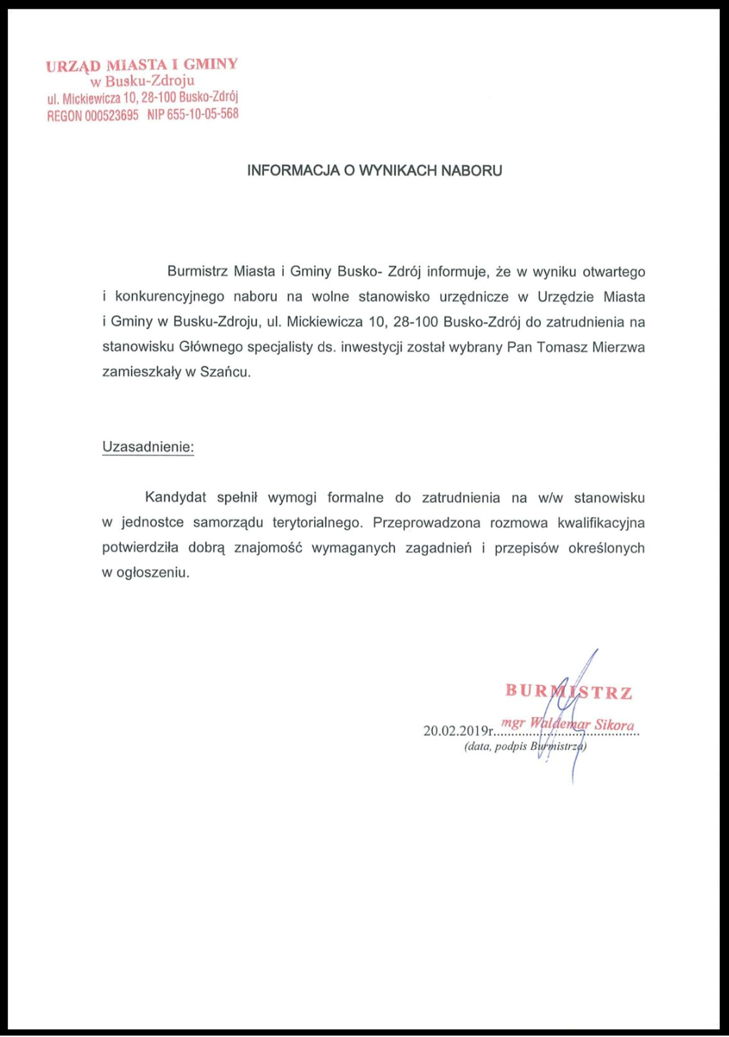 Pismem z dnia 20.02.2019 r. burmistrz Buska poinformował, iż „w wyniku otwartego i konkurencyjnego naboru na wolne stanowisko urzędnicze w UMiG do zatrudnienia na stanowisku Głównego specjalisty ds. inwestycji został wybrany Pan Tomasz Mierzwa zamieszkały w Szańcu.”