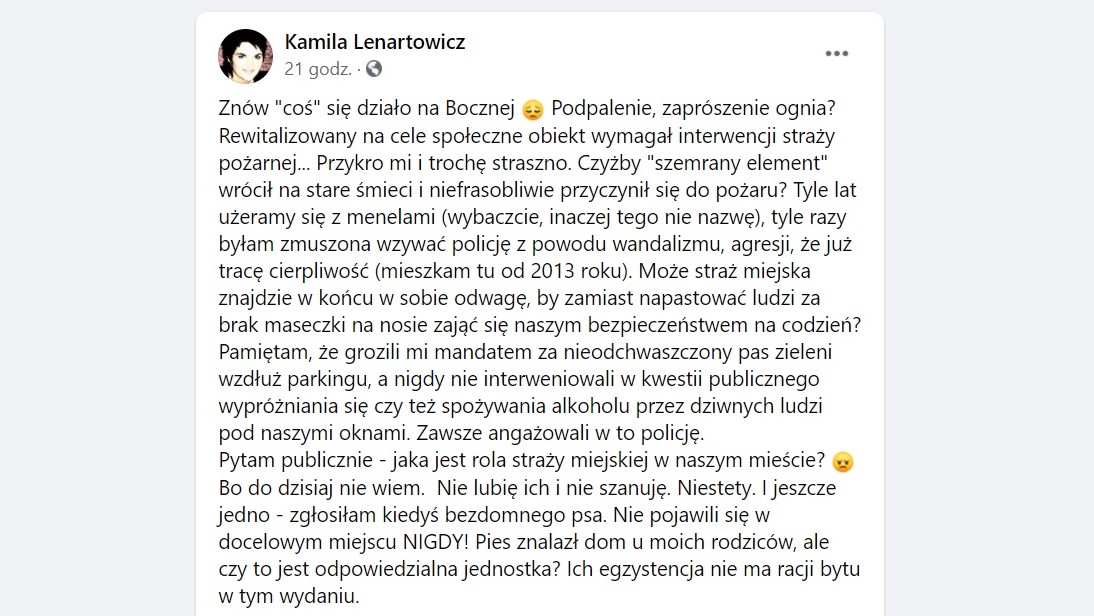Przesyłam screena profilu Kamili Lenartowicz na Facebooku oraz własne zdjęcia zrobione dziś po południu. Widać okopcona ścianę nad otworem okiennym od strony ulicy Kopernika.