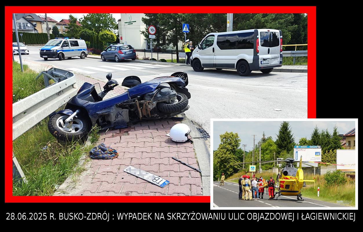 ○ 28.06.2025 r., około godziny 10:00 w Busku-Zdroju na skrzyżowaniu ul. Objazdowej z ul. Łagiewnicką, DK73’, doszło do poważnego wypadku z udziałem furgonetki Opel Vivaro i motocykla Yamaha. Dwie osoby są poważnie ranne po zderzeniu motocykla z busem. Interweniowało Lotnicze Pogotowie Ratunkowe / fot.busko.com.pl [PEŁNA FOTORELACJA♂]