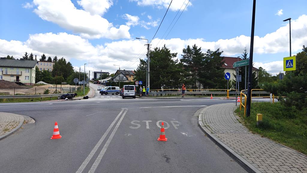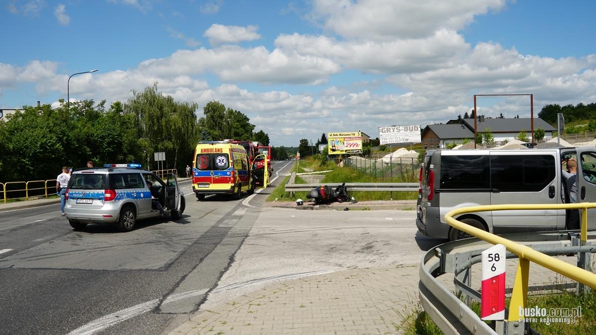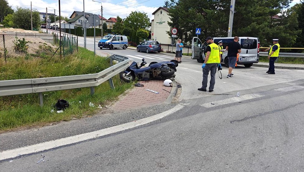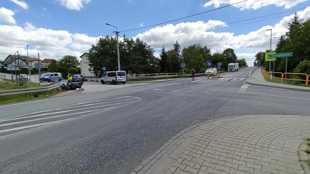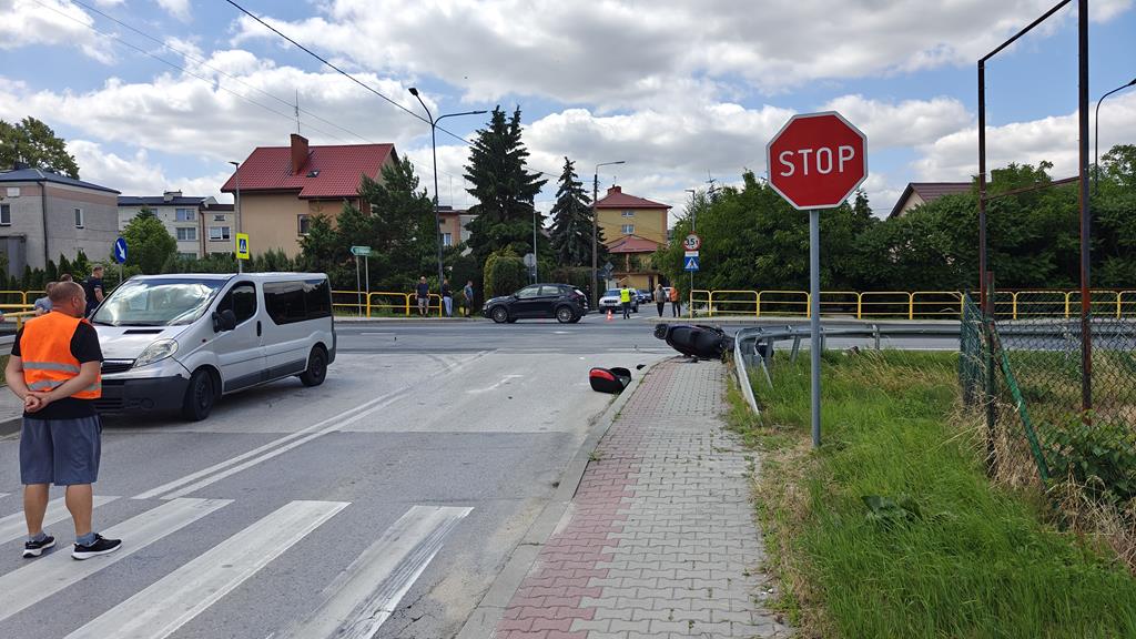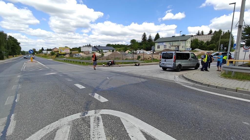 ○ 28.06.2025 r., około godziny 10:00 w Busku-Zdroju na skrzyżowaniu ul. Objazdowej z ul. Łagiewnicką, DK73’, doszło do poważnego wypadku z udziałem furgonetki Opel Vivaro i motocykla Yamaha / fot. infoBusko.pl