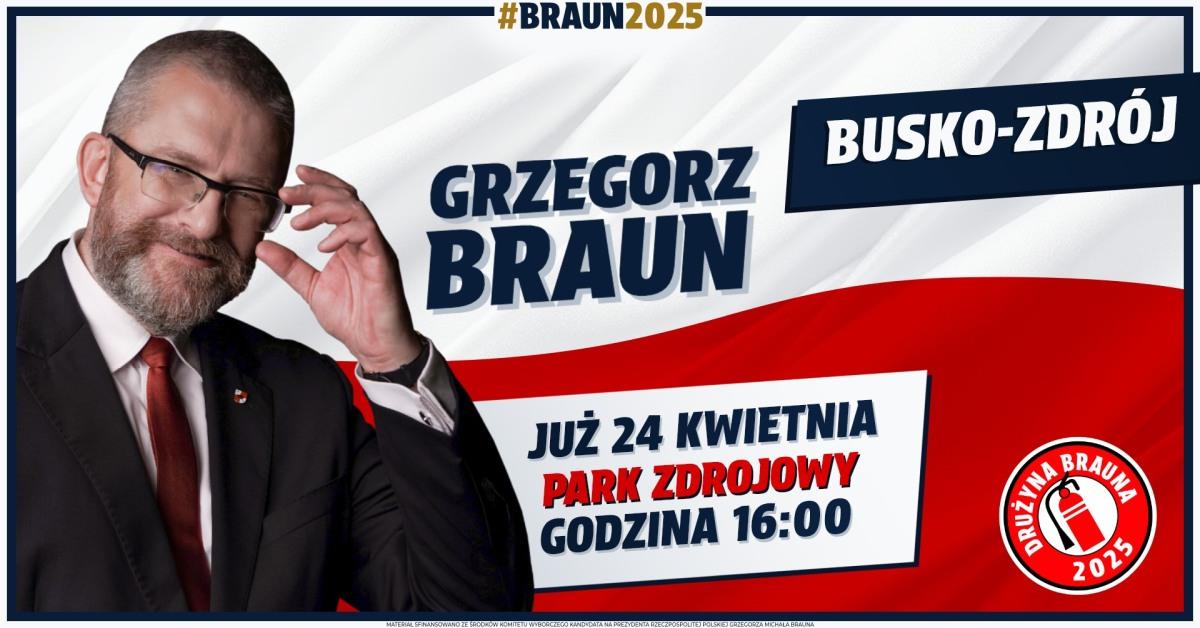 W ten czwartek, 24 kwietnia 2025 r. w muszli koncertowej buskiego Parku Zdrojowego odbędzie się spotkanie z Grzegorzem Braunem, prezesem Konfederacji Korony Polskiej, kandydatem na urząd Prezydenta Rzeczypospolitej Polskiej.