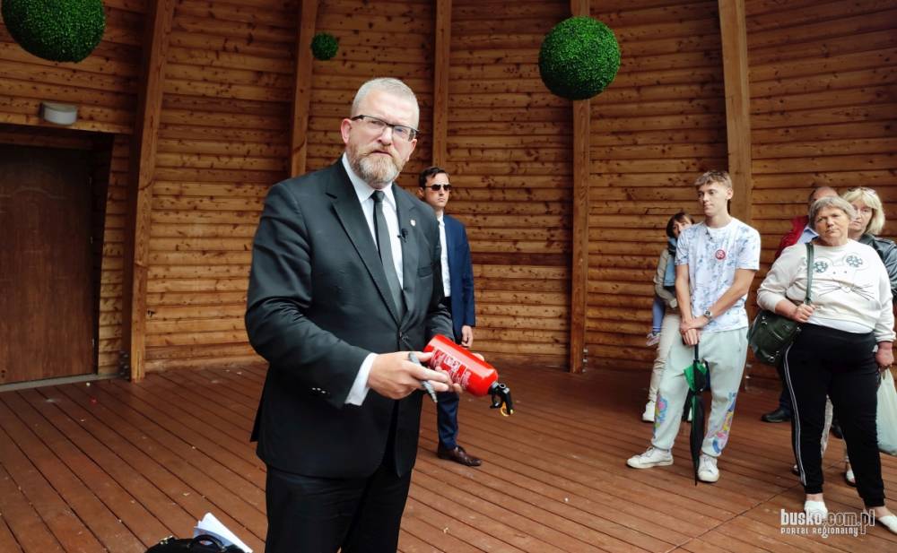 ○ Busko-Zdrój, 4 czerwca 2024: Na kilka dni przed wyborami do Parlamentu Europejskiego kandydat do europarlamentu w okręgu małopolsko-świętokrzyskim’, poseł Konfederacji Grzegorz Braun spotkał się w Parku Zdrojowym z mieszkańcami i kuracjuszami słonecznego miasta ze złotą monstrancją w herbie. Na zakończenie spotkania rozdawał autografy na gaśnicach. / fot. busko.com.pl♂