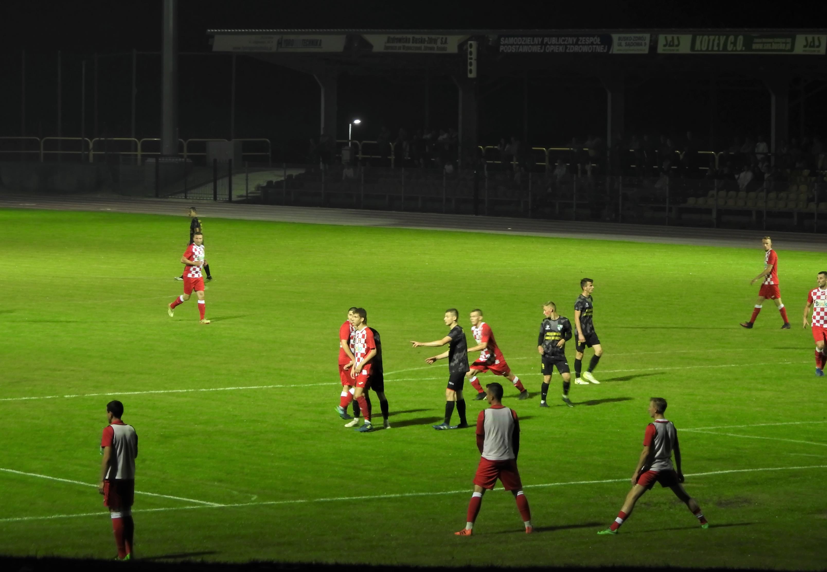 Lepiej to spotkanie rozpoczęli goście, bo już w 2 minucie strzelili nam bramkę z rzutu rożnego. Źle weszliśmy w mecz, za dużo chaosu, nerwowe rozgrywanie, akcje były szarpane a na domiar złego w 20 minucie straciliśmy po kontrze 2 bramkę. Nerwowość i frustracja narastała, nieodpowiedzialne zachowanie Kowalskiego, który nie wytrzymał ciśnienia uderzając łokciem przeciwnika za co otrzymał czerwoną kartkę w 40 minucie osłabiając zespół. O dziwo grając w dziesięciu lepiej wyglądaliśmy niż w jedenastu. Cała druga połowa mimo braku jednego zawodnika toczyła się na połowie przeciwnika. Brakowało chłodnej głowy, brakowało trochę szczęścia bo były okazję ku temu by przynajmniej zremisować.