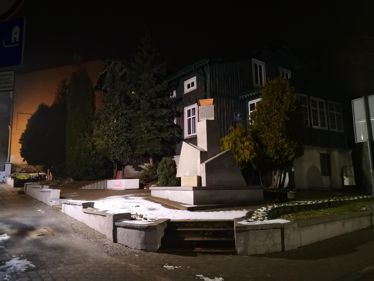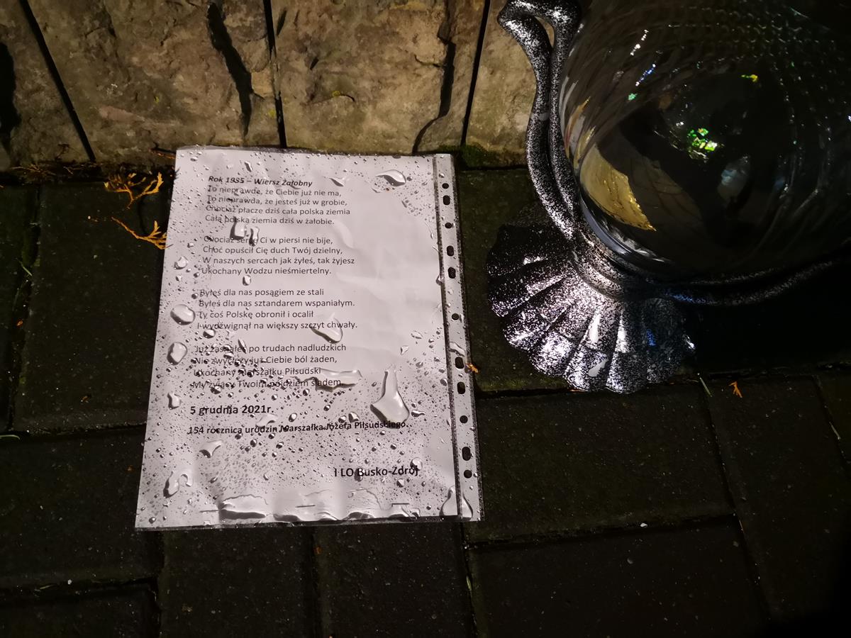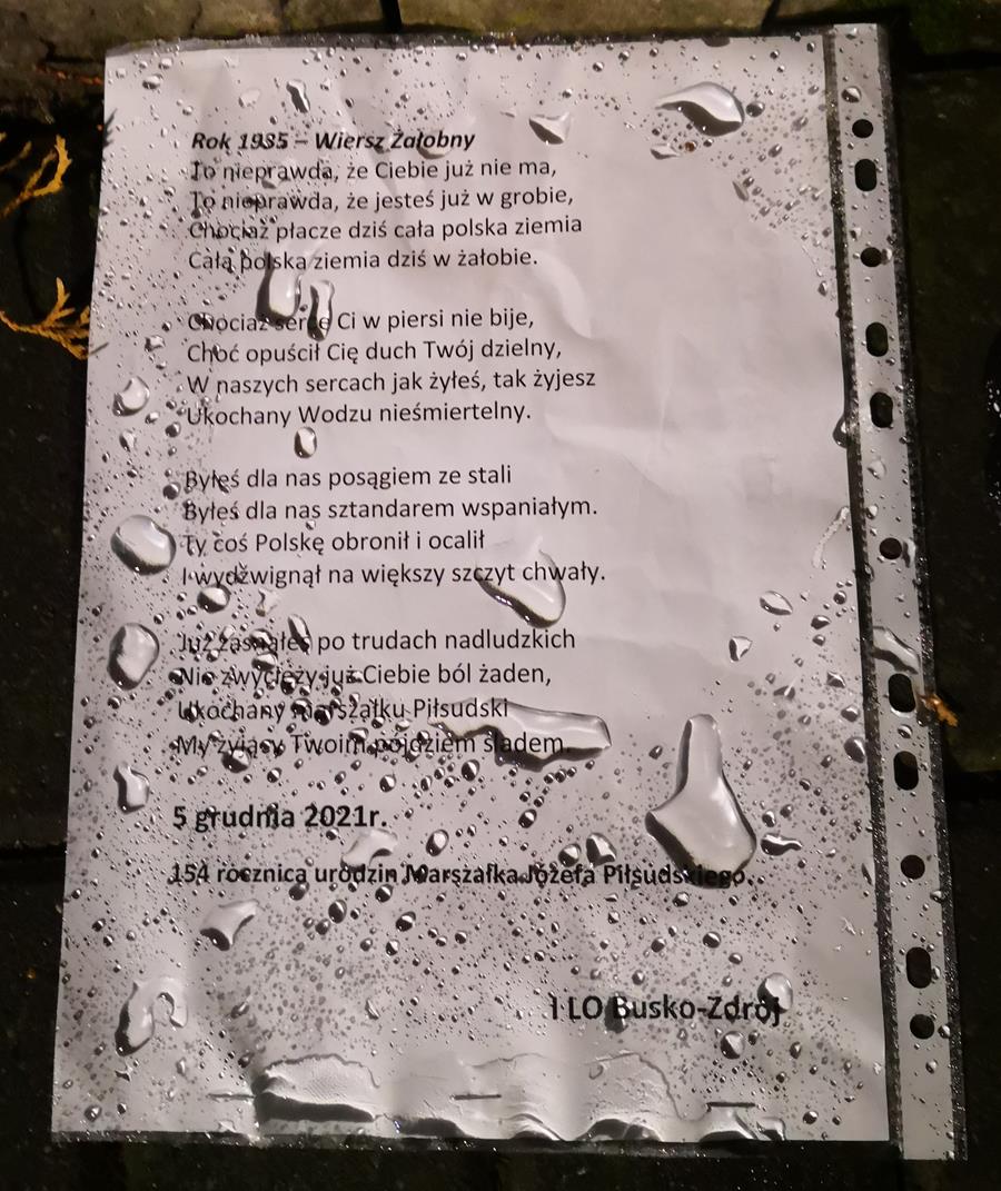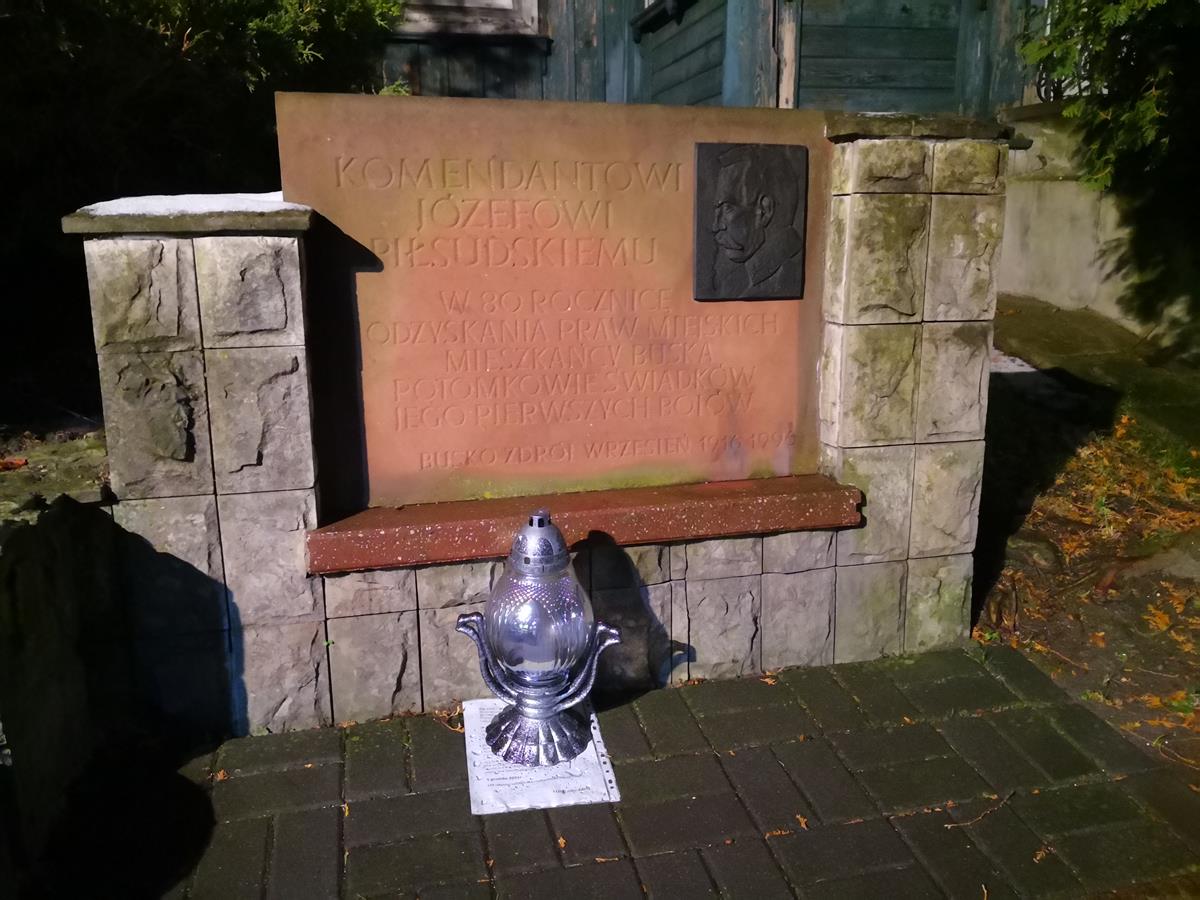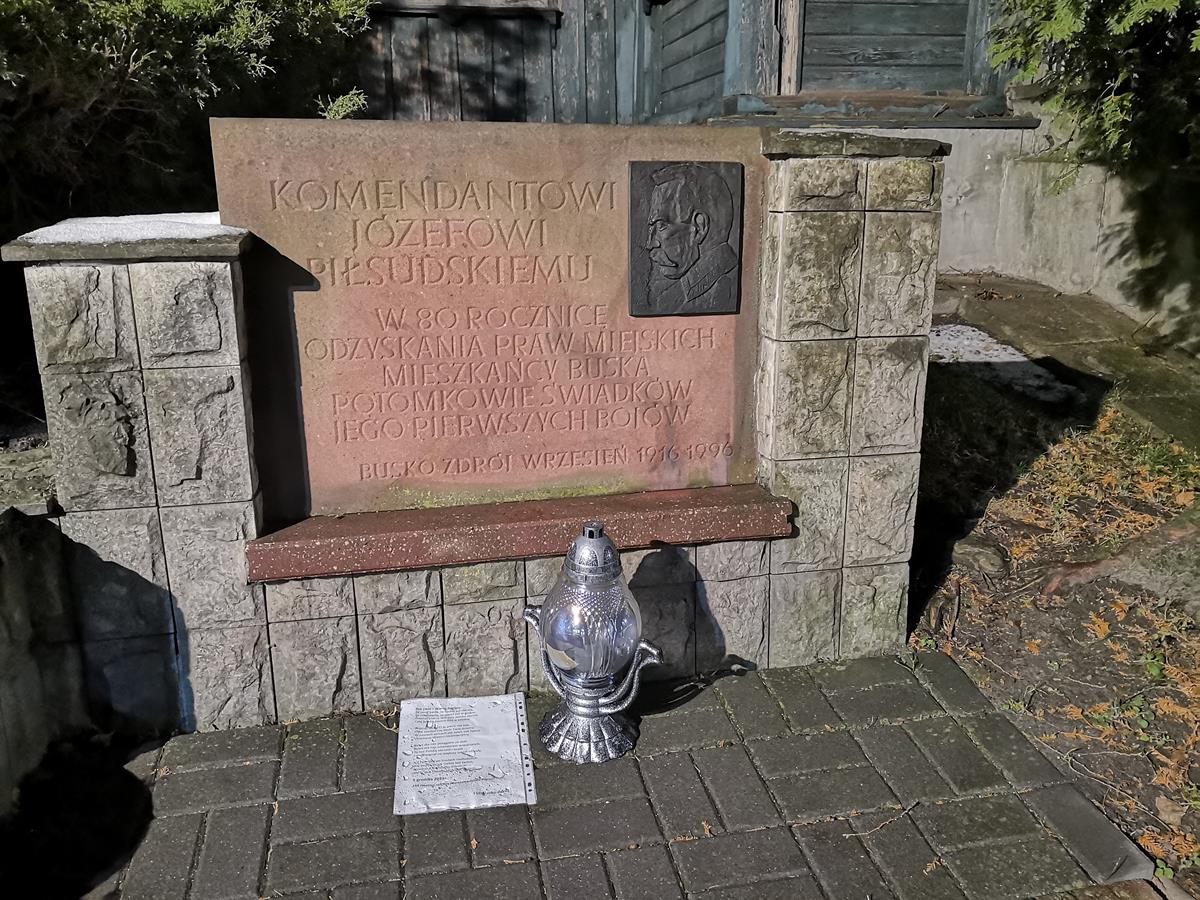 Jarosław Kruk: 5 grudnia 2021 r., w 154. rocznicę urodzin marszałka Józefa Piłsudskiego,  udałem się wieczorem pod skromny buski memoriał(*) jednego – bodaj pierwszego – z ojców niepodległości Polski, ulokowany przy Willi Polonia u zbiegu Alei Adama Mickiewicza i ulicy Tadeusza Kościuszki. Miejsce to – sądząc po liczbie zlokalizowanych tam obelisków i tablic – jest pomnikowym centrum pamięci słonecznego miasta ze złotą monstrancją w herbie.