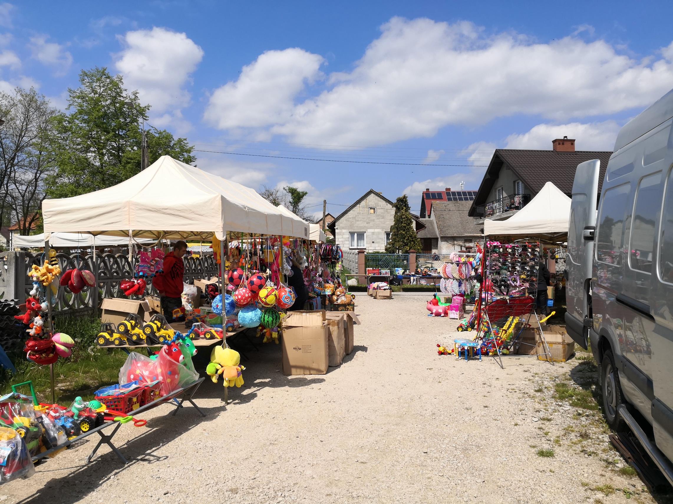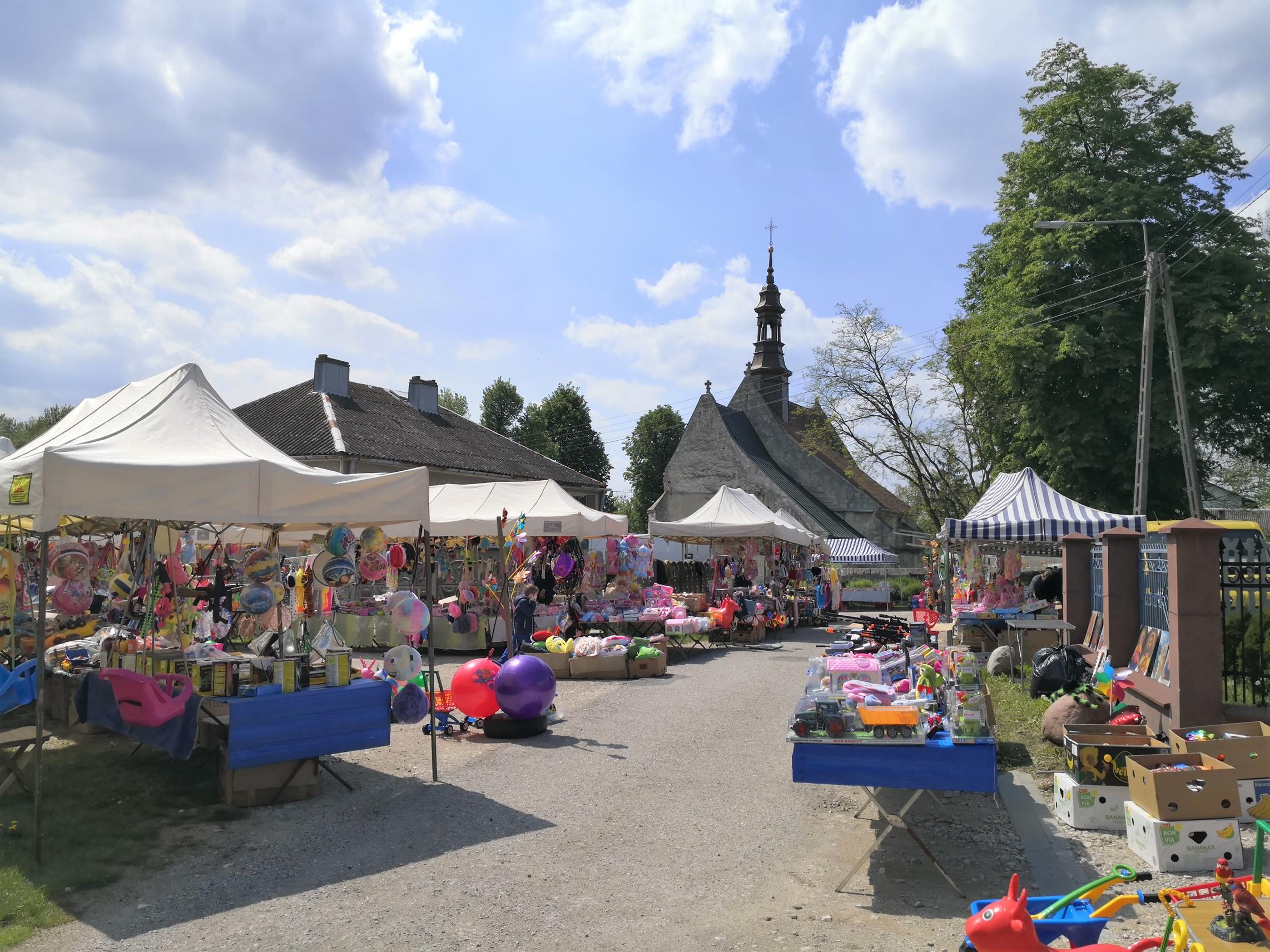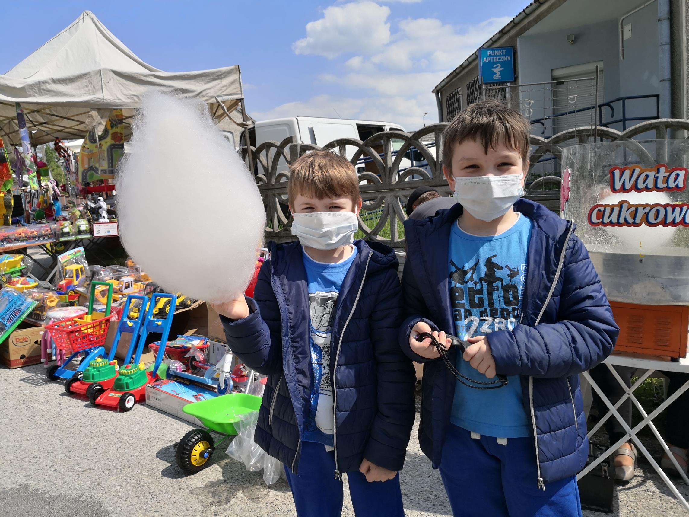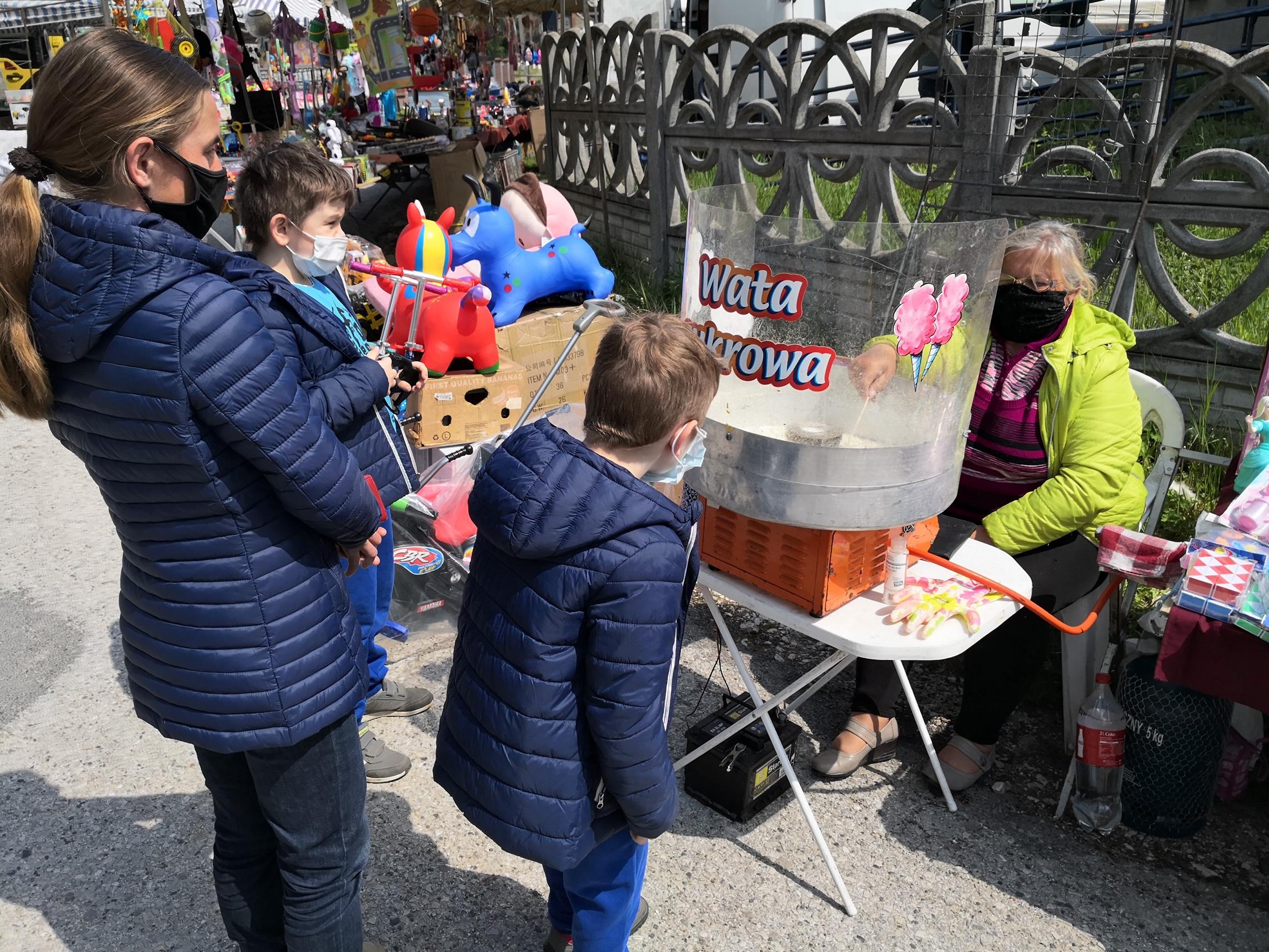 I takie właśnie parafialne święto miało miejsce po raz kolejny 16.05.2020 r. Miałem okazję być gościem na towarzyszącym mu kiermaszu. Zjawiłem się dość późno, bo po godzinie 14. Było już niewiele osób i stragany zaczynano właśnie składać. Udało mi się jednak „łyknąć” nieco odpustowej atmosfery, zobaczyć kolejny raz jak robi się tradycyjny smakołyk – cukrową watę na patyku – przysmak maluchów i zrobić nieco pamiątkowych zdjęć.