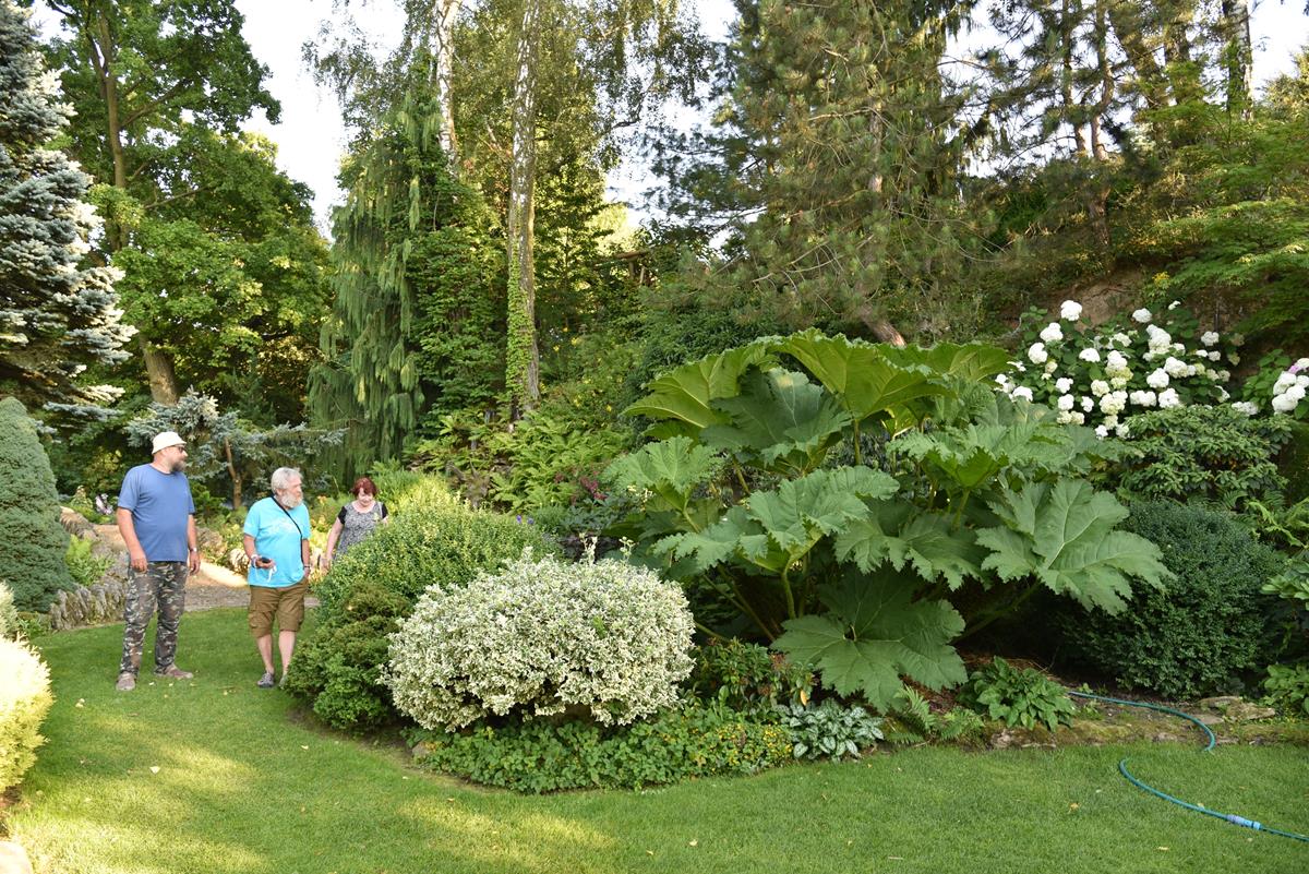 Młodzawy Małe, 28 lipca 2020 r. – Gospodarz Tadeusz Kruszyna i goście: Aleksander i Gabriela Doba oraz największa bylina świata – gunnera brazylijska, nazywana rabarbarem olbrzymim. / fot. © Jarosław Kruk; infobusko.pl