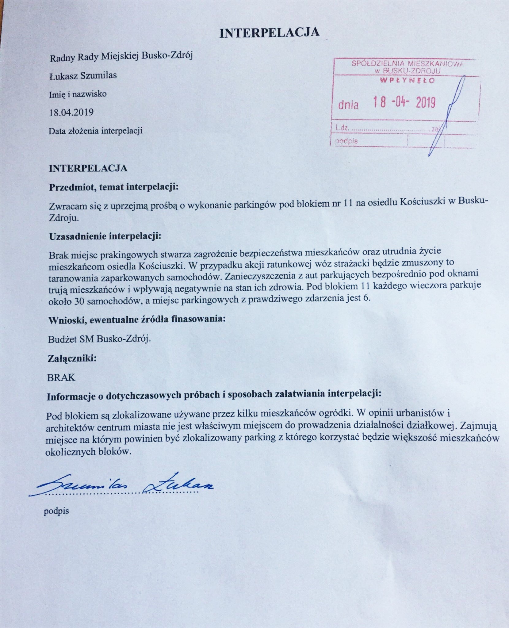 W uzasadnieniu można przeczytać: – Brak miejsc parkingowych stwarza zagrożenie bezpieczeństwa mieszkańców oraz utrudnia życie mieszkańcom osiedla Kościuszki. W przypadku akcji ratunkowej wóz strażacki będzie zmuszony do taranowania zaparkowanych samochodów. Zanieczyszczenia z aut parkujących bezpośrednio pod oknami trują mieszkańców i wpływają negatywnie na stan ich zdrowia. Pod blokiem 11 każdego wieczora parkuje około 30 samochodów, a miejsc parkingowych z prawdziwego zdarzenia jest 6.
