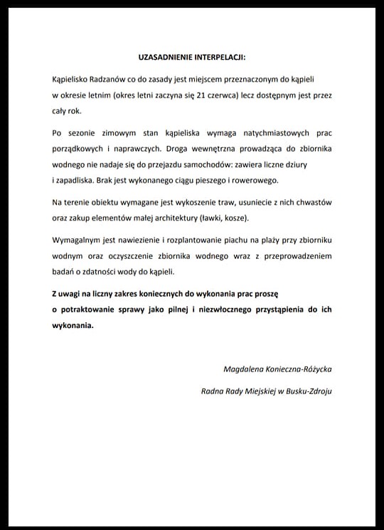 JKR: Za kilkumiesięcznej kadencji obecnego, nowego buskiego parlamentu to już druga interpelacja w sprawie miejskiego kąpieliska w Radzanowie. Pierwszą do burmistrza skierował radny Łukasz Szumilas 18 lutego br.