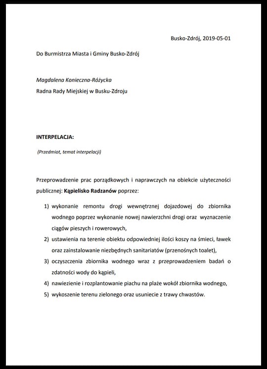 2. […] infobusko.pl [8.05.2019]: – Interpelacje radnych: Magdalena Konieczna-Różycka odnośnie Kąpieliska Radzanów […]