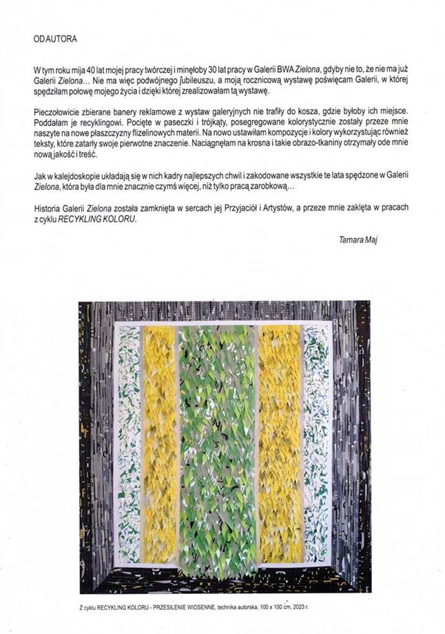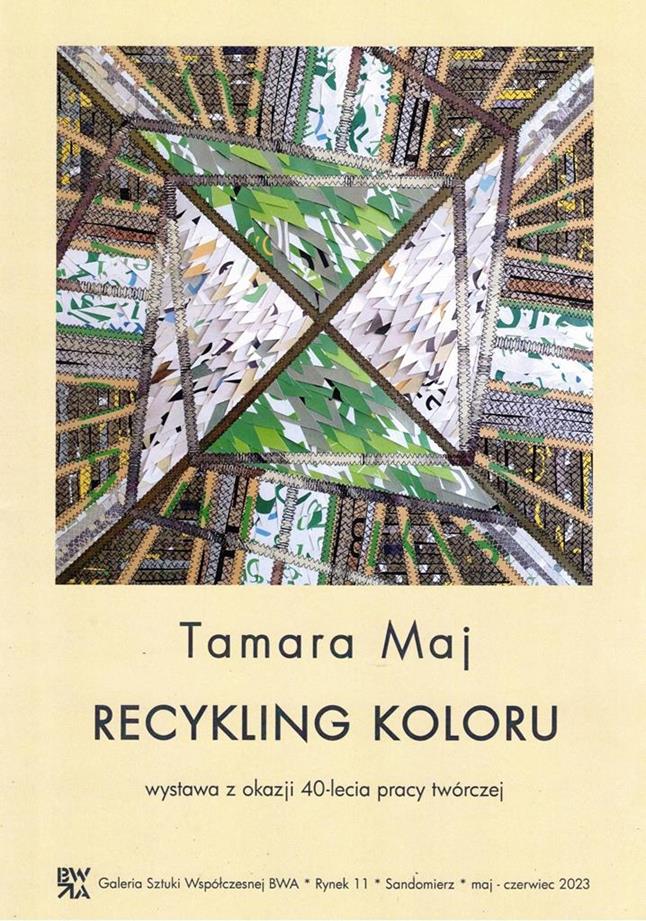 „Recykling koloru ”– to tytuł nowej wystawy w Galerii Biura Wystaw Artystycznych w Sandomierzu. Jej autorką jest Tamara Maj, artystka przez wiele lat związana z Galerią Zielona w Busku-Zdroju. Prezentacja nawiązuje do jubileuszu 40-lecia jej pracy twórczej. – informuje 28.05.2023 portal Radio Kielce