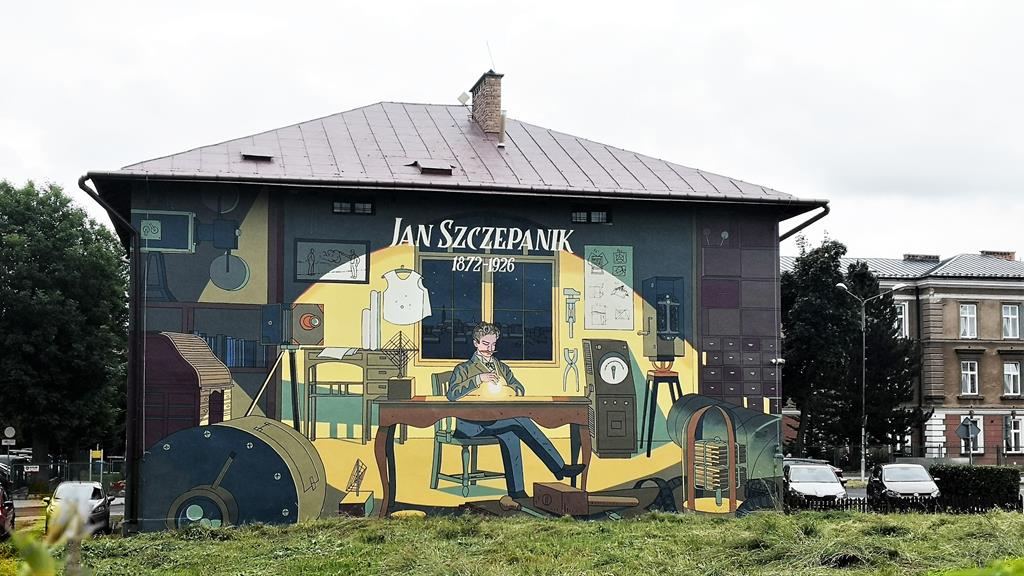 ○ Jan Szczepanik’ (ur. 13 czerwca 1872 w Rudnikach k. Mościsk, zm. 18 kwietnia 1926 w Tarnowie) – polski wynalazca, zwany „polskim Edisonem”, „austriackim Edisonem”, „Leonardem da Vinci z Galicji” i „galicyjskim geniuszem”. Opisany w dwóch artykułach przez Marka Twaina. Pomimo tego, że w dziedzinie techniki był samoukiem, jest autorem ponad 50 wynalazków i kilkuset opatentowanych pomysłów technicznych z dziedziny fotografii barwnej, tkactwa czy telewizji…[♂Wikipedia] | ○ Mural na budynku Zespołu Szkół Ogólnokształcących i Technicznych im. Jana Szczepanika w Tarnowie’ / fot. Jarosław Kruk infoBusko.pl | ○ Jan Szczepanik’ (~1900) / Wikimedia Commons♂