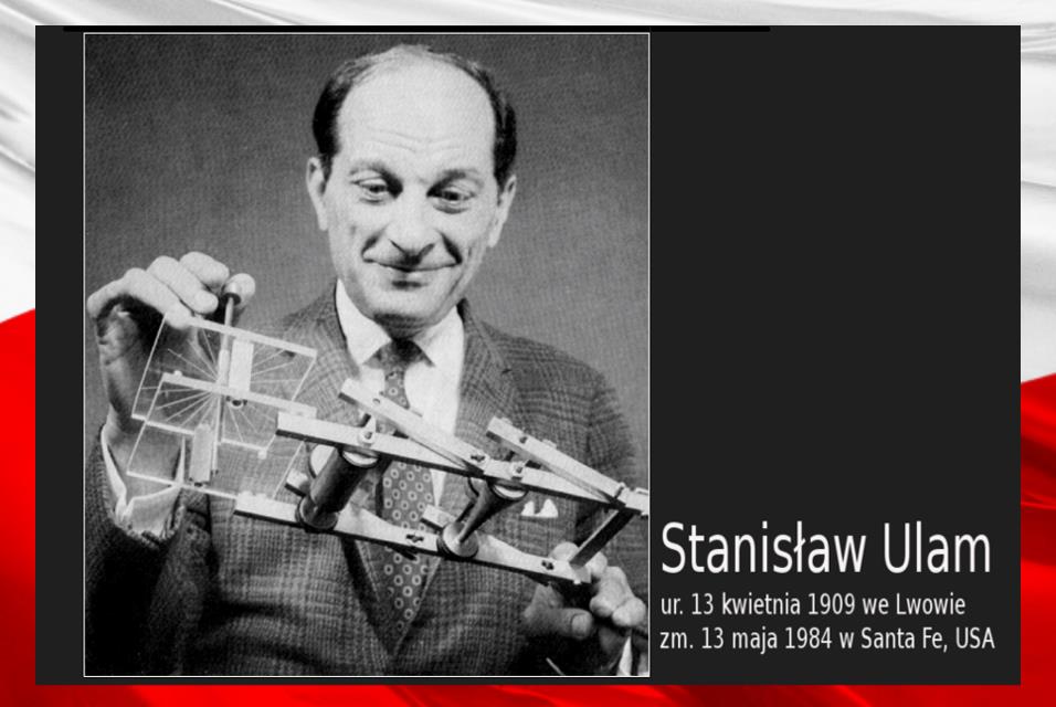 ○ Stanisław Marcin Ulam (ur. 13 kwietnia 1909 we Lwowie, zm. 13 maja 1984 w Santa Fe w stanie Nowy Meksyk) – polski matematyk, przedstawiciel lwowskiej szkoły matematycznej, współtwórca amerykańskiej bomby termojądrowej. Ulam ma wielkie dokonania w zakresie matematyki i fizyki matematycznej w dziedzinach topologii, teorii mnogości, teorii miary, procesów gałązkowych. Ulam był także twórcą metod numerycznych, na przykład metody Monte Carlo. Był też jednym z pierwszych naukowców, którzy wykorzystywali w swych pracach komputer. Metody komputerowe zostały użyte przez Ulama do modelowania powielania neutronów oraz rozwiązania problemu drgającej struny zawierającej element nieliniowy (układ oscylujący Fermiego-Pasty-Ulama)…♂Wikipedia / źródło: Wikimedia Commons♂