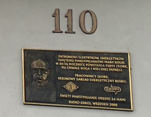 ○ We wrześniu 2008 r. na ścianie Zakładu Energetycznego w Busku-Zdroju♂ dokonano uroczystego odsłonięcia pamiątkowej tablicy św. Maksymilian Maria Kolbe / Busko-Zdrój, 28.04.2022 / fot. Jarosław Kruk infoBusko.pl