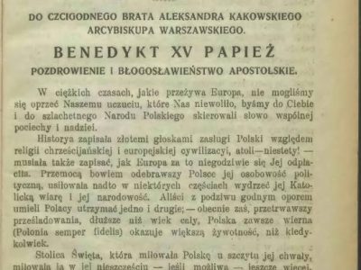 Na progu odzyskania niepodległości przez Polskę, papież Benedykt XV 15 października 1918 r. wydał „Orędzie Ojca św. do Narodu Polskiego”. Poniższy tekst został opublikowany w: „Wiadomości Archidyecezyalne Warszawskie”, Rok VIII (1918), nr 10, październik, dodatek.