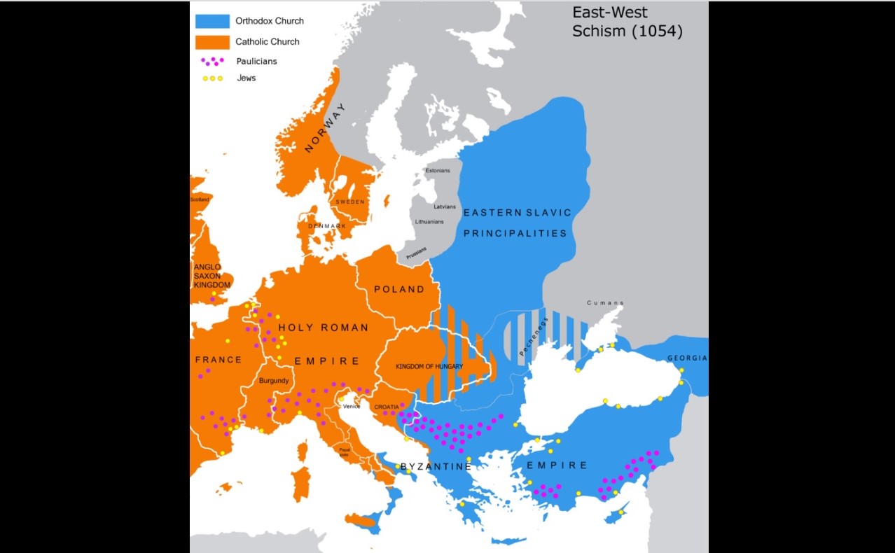 Wikipedia: Wielka schizma wschodnia – rozłam w chrześcijaństwie na Kościół wschodni i zachodni. Za symboliczną datę tego wydarzenia przyjmuje się rok 1054. Nie był to jednorazowy akt, lecz proces, który rozciągał się w szerokich ramach chronologicznych, trwający aż do XIII w. Wtedy wiele osób nie zdawało sobie sprawy z istnienia schizmy. Winą za jej powstanie obarcza się zarówno Rzym, jak i Konstantynopol. Wielką schizmę poprzedziły dwie inne: schizma akacjańska (484–519) i schizma Focjusza (861–867). [link]