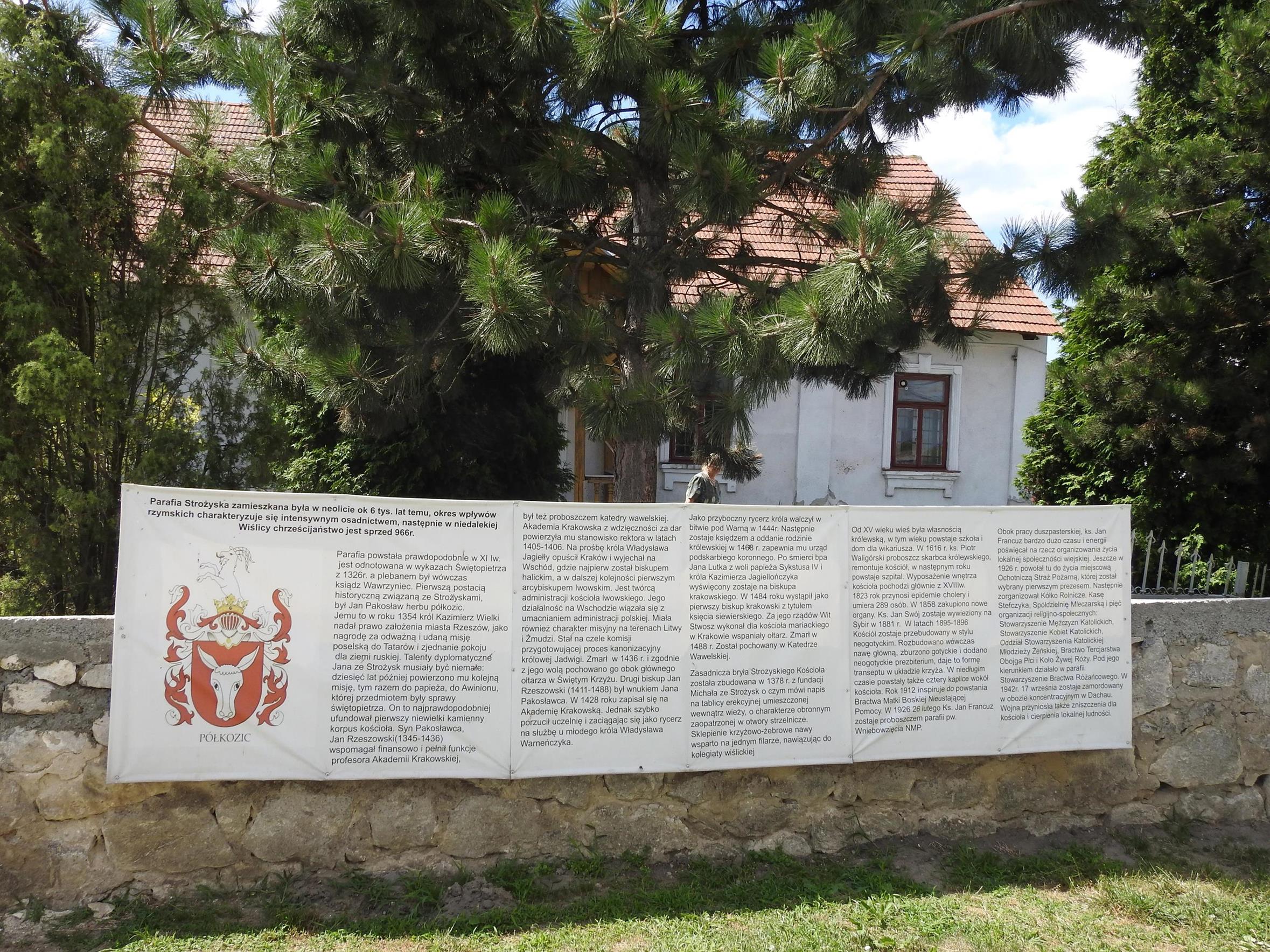 2.08.2020: Strożyska’, gm. Nowy Korczyn: Historię wsi i Parafii Strożyska przedstawia baner umieszczony na murze okalającym świątynię. [duży format po kliknięciu na zdjęcie] / fot. Jarosław Kruk infoBusko.pl