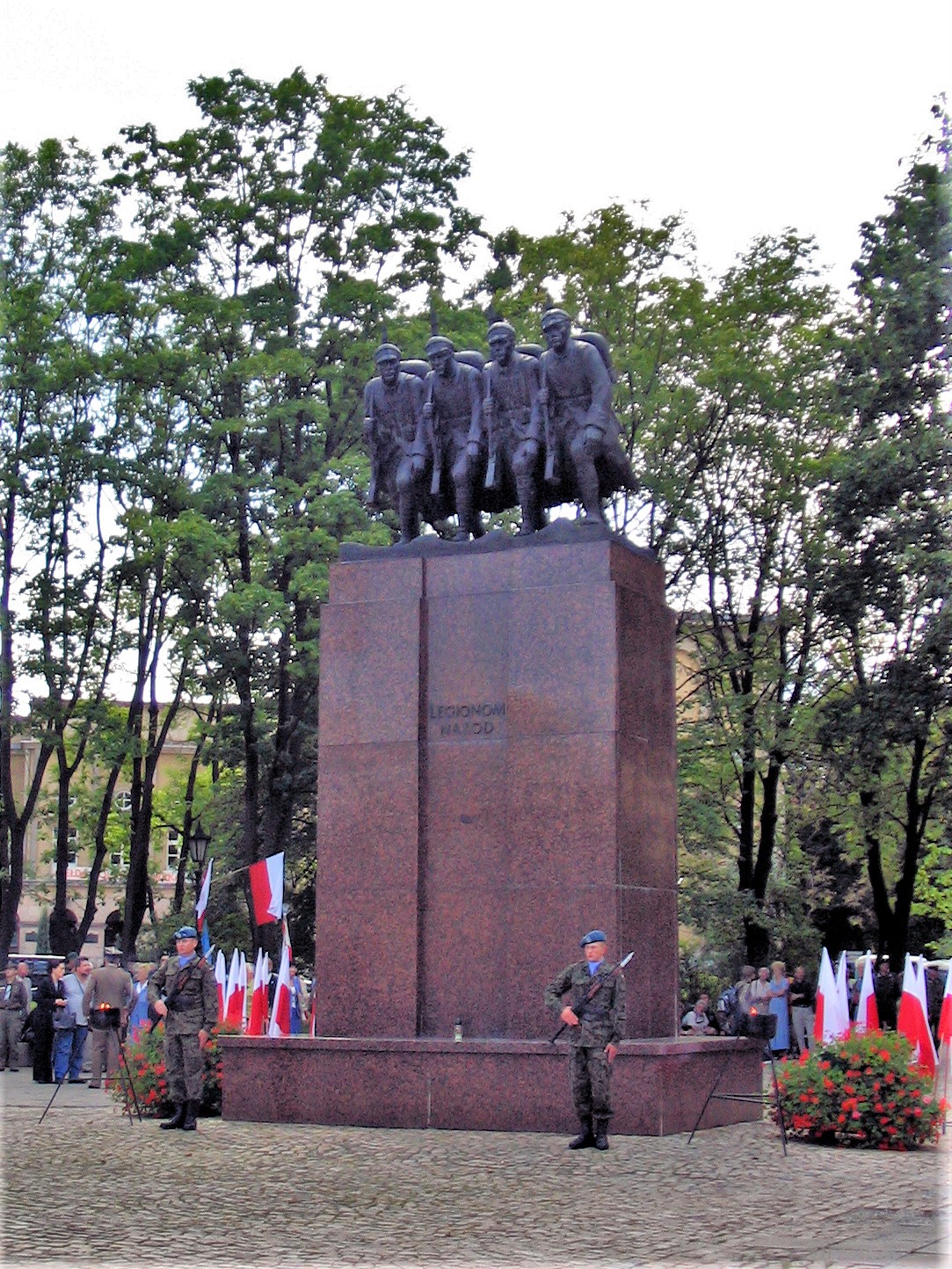 „Czwórka legionowa” czterech polskich żołnierzy, symbolizujących Królestwo Polskie, Małopolskę, Śląsk i Wielkopolskę rzeźba Jana Raszki z 1917 r. upamiętniająca legionistów. Uroczystość 92. rocznicy wkroczenia Pierwszej Kompanii Kadrowej do Kielc (2006) / fot. Grzegorz Pietrzak; Wikipedia