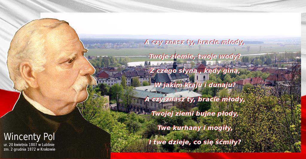 ○ Wincenty Pol’, portret, 1874, autor: Juliusz Kossak’ / źródło: Wikipedia ♂ | ○ Pińczów / fot. Jarosław Kruk, Wikipedia♂ |○„Pieśń o Ziemi naszej”♂