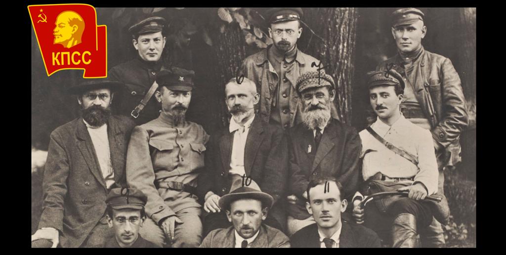 ○ Tymczasowy Komitet Rewolucyjny Polski ♂ na początku sierpnia 1920. W środkowym rzędzie od lewej: Iwan Skworcow-Stiepanow♂, Feliks Dzierżyński♂, Julian Marchlewski♂, Feliks Kon♂ | КпСС (Коммунистическая партия Союз Советских) Komunistyczna Partia Związku Sowietów♂ / źródło: Wikipedia