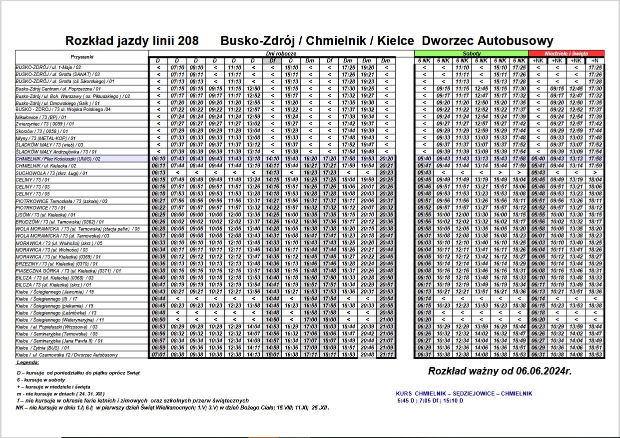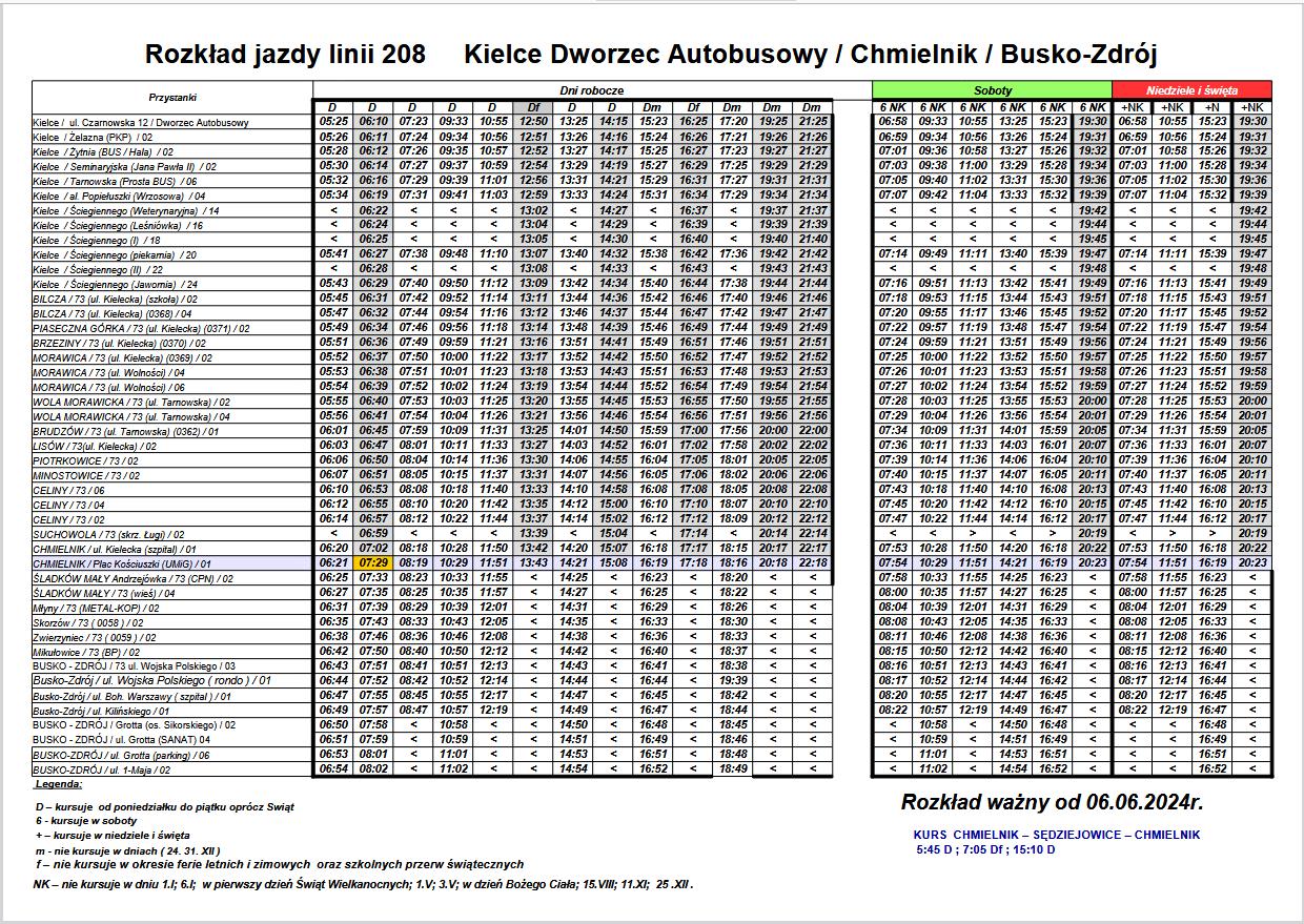 MPK Kielce: Aktualny rozkład jazdy autobusów linii 208 (od 06.06.2024)