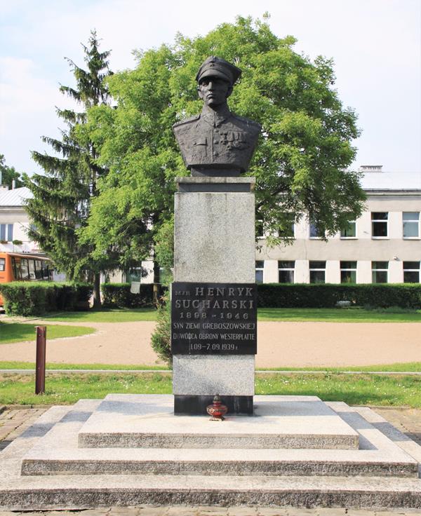 ○ 1./ Gręboszów, centrum / Wikipedia♂ | 2.,3.,4.: Pomnik mjr Henryka Sucharskiego stoi w Gręboszowie♂, przed szkołą noszącą jego imię. / fot. Jarosław Kruk, Wikipedia♂