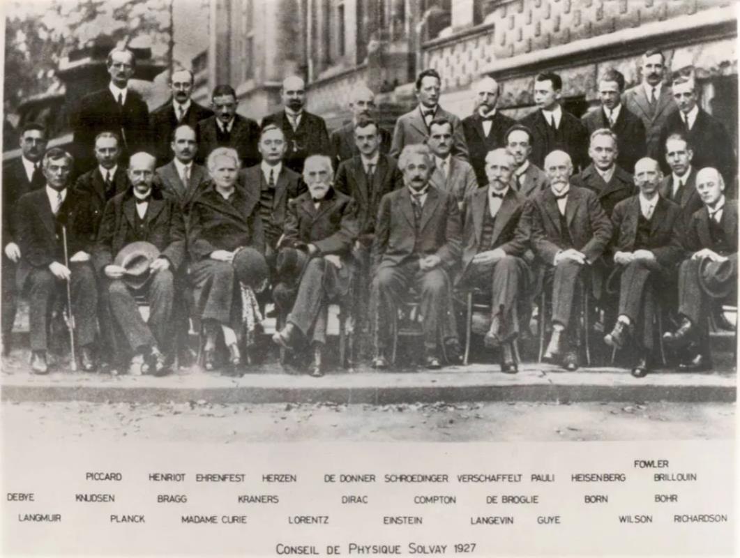Siedzą (w drugim rzędzie): Peter Debye, Martin Knudsen, William L. Bragg, Hendrik A. Kramers, Paul Dirac, Arthur Compton, Louis de Broglie, Max Born, Niels Bohr.