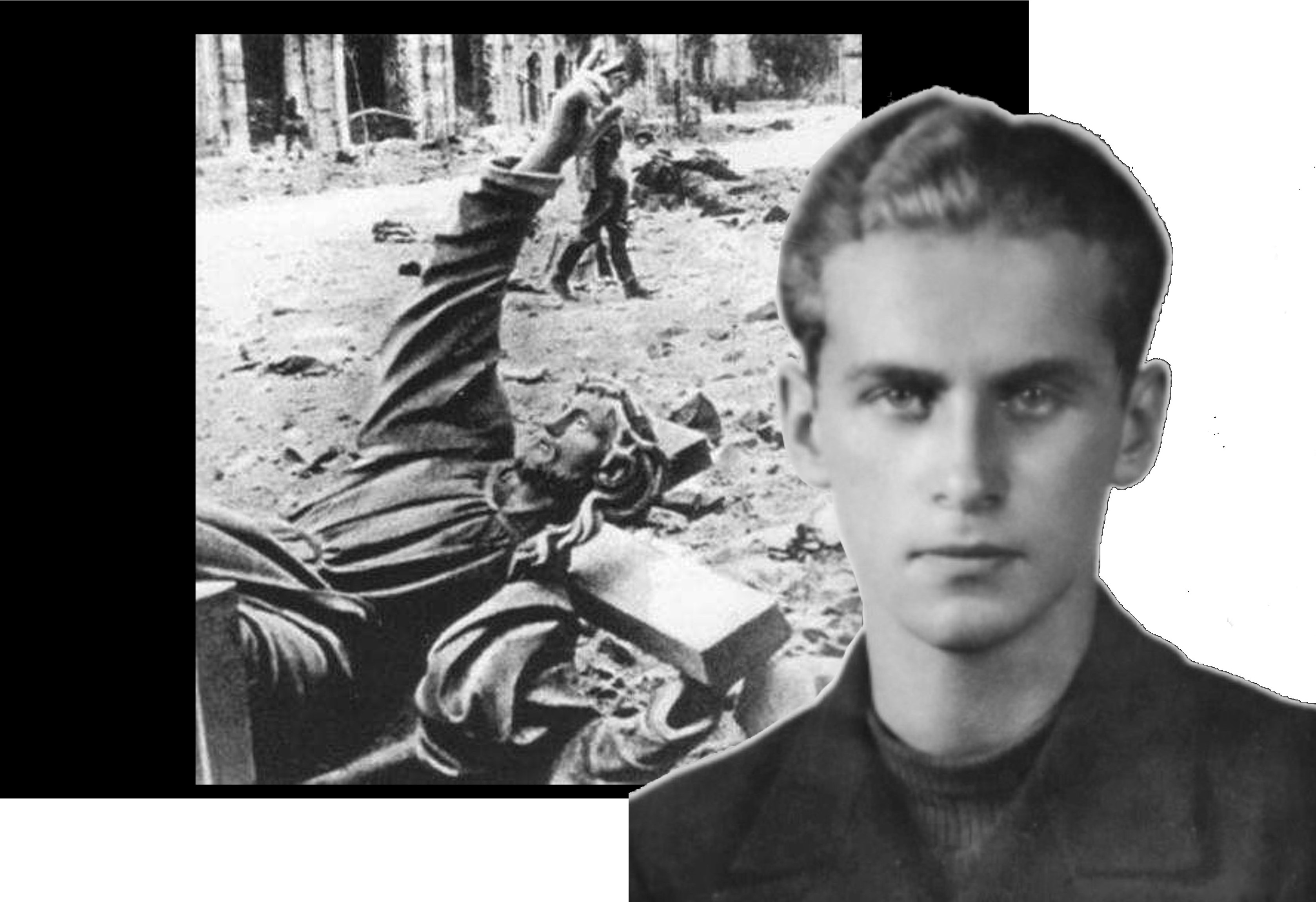 ○ Krzysztof Kamil Baczyński rep. Andrzej Szypowski/East News | Ocalała figura Chrystusa przy kościele św. Krzyża wśród warszawskich gruzów, po Powstaniu Warszawskim 1944 r. Chrystus, choć leżący, nadal wskazywał ręką niebo / źródło Wikipedia