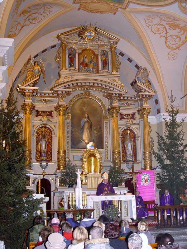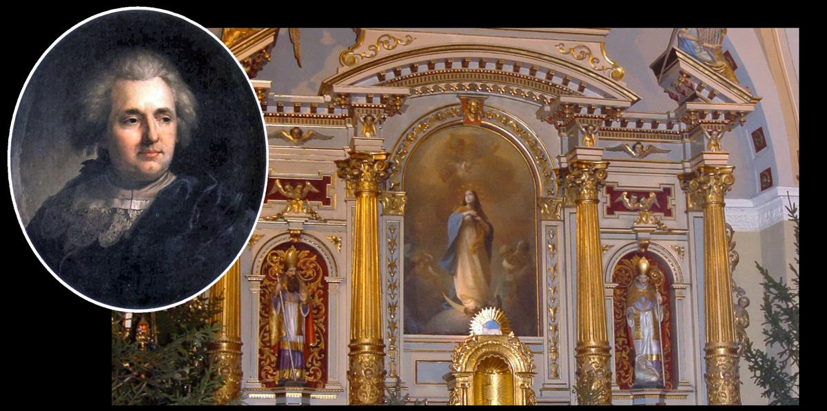 4. Ołtarz główny z 1804r. w kościele Niepokalanego Poczęcia Najświętszej Marii Panny w Busku-Zdroju’. Obraz NMP autorstwa Franciszka Smuglewicza./ fot. Jarosław Kruk, Wikipedia♂W Busku-Zdroju, słonecznym mieście ze złotą monstrancją w herbie’ , osiemnastowieczny Obraz Matki Boskiej Niepokalanie Poczętej w otoczeniu aniołów, znajdujący się w ołtarzu głównym kościoła NMPNM w Busku-Zdroju’ jest również – jak można przeczytać na e-stronie Diecezji Kieleckiej♂ – prawdopodobnie autorstwa Franciszka Smuglewicza.