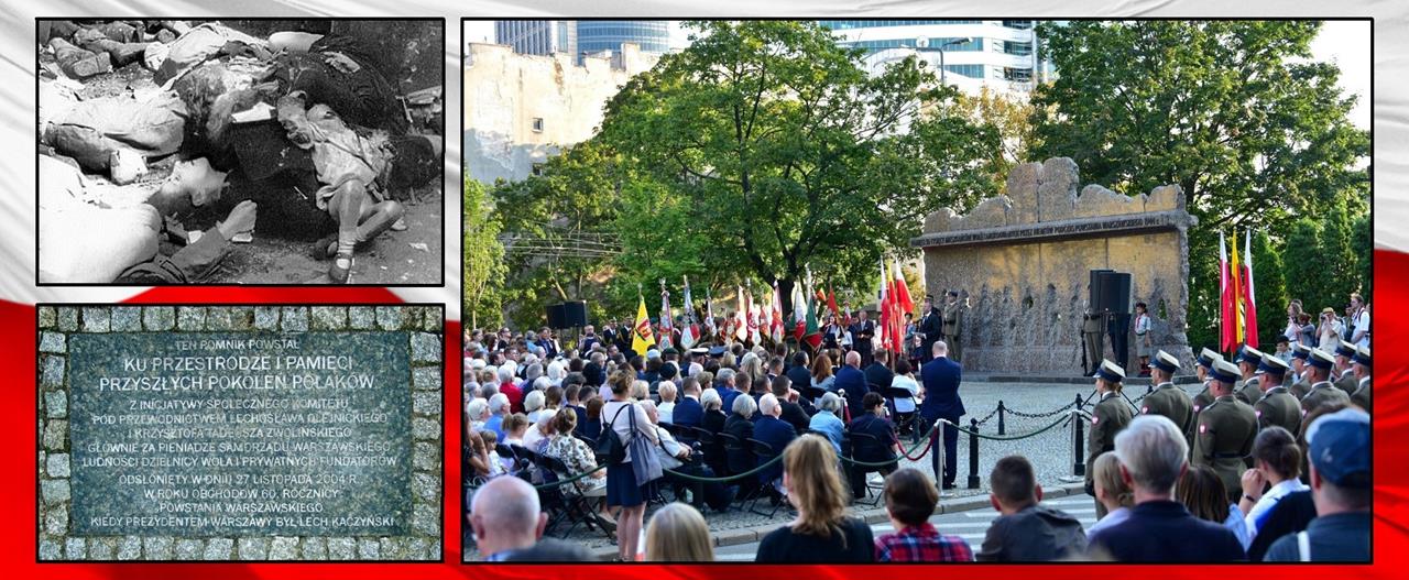 ○ Ofiary dokonanej przez Niemców rzezi / Stowarzyszenie Pamięci Powstania Warszawskiego 1944♂ | Tablica informacyjna przy pomniku / Wikipedia♂ | Uroczystości rocznicowe pod pomnikiem Ofiar Rzezi Woli w Warszawie, 5 sierpnia 2019 r. / fot. Adrian Grycuk, Wikipedia♂