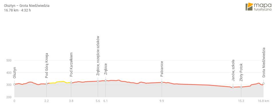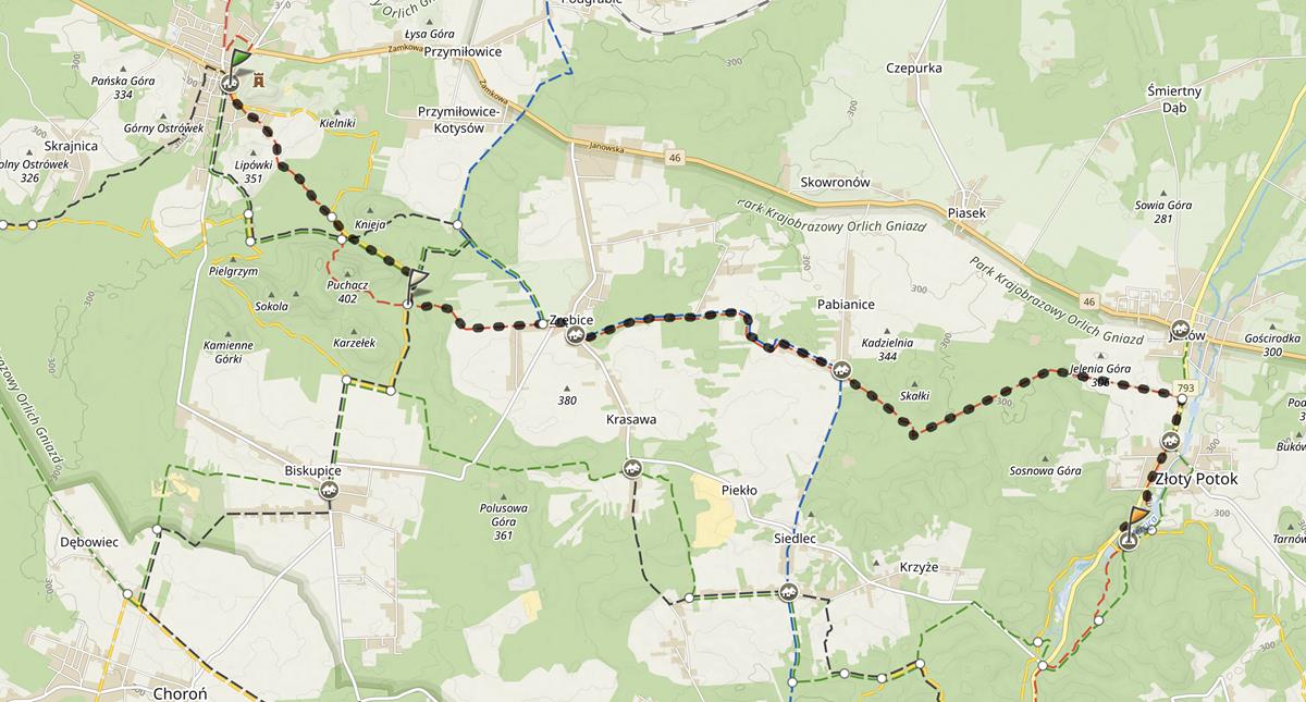 - Trasa: Olsztyn ruiny zamku♂ – Góra Biakło „Mały Giewont”(340 m n.p.m.)♂ – Złoty Potok♂– Grota Niedźwiedzia♂